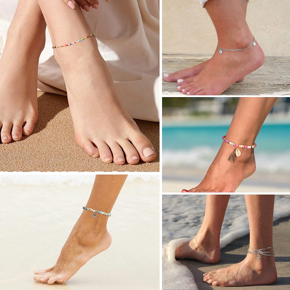 Sanfenly أساور الكاحل للنساء، مجوهرات الكاحل، الذهب والفضة لطيف الصيف بوهو شاطئ شل فراشة حجر الراين مطرز عين الشر ثعبان القلب سلحفاة همسة الشمس الفيل موجة زهرة نجم البحر عملة روز نجمة إنفينيتي اللؤلؤ سحر الطبقات خلخال مجموعة قابل للتعديل