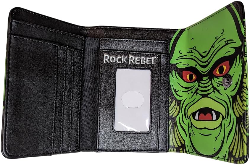This haunting tri-fold wallet opens to reveal the Creature from the Black Lagoon! Graphic printed and embossed on vegan leather. Makes a monster gift for any fan of the classic 1954 horror film. Measures approximately 6” x 4.25” x 1” when closed and opens to 12”. Secures closed with a magnetic snap. Officially licensed Universal Monsters merchandise by Rock Rebel.