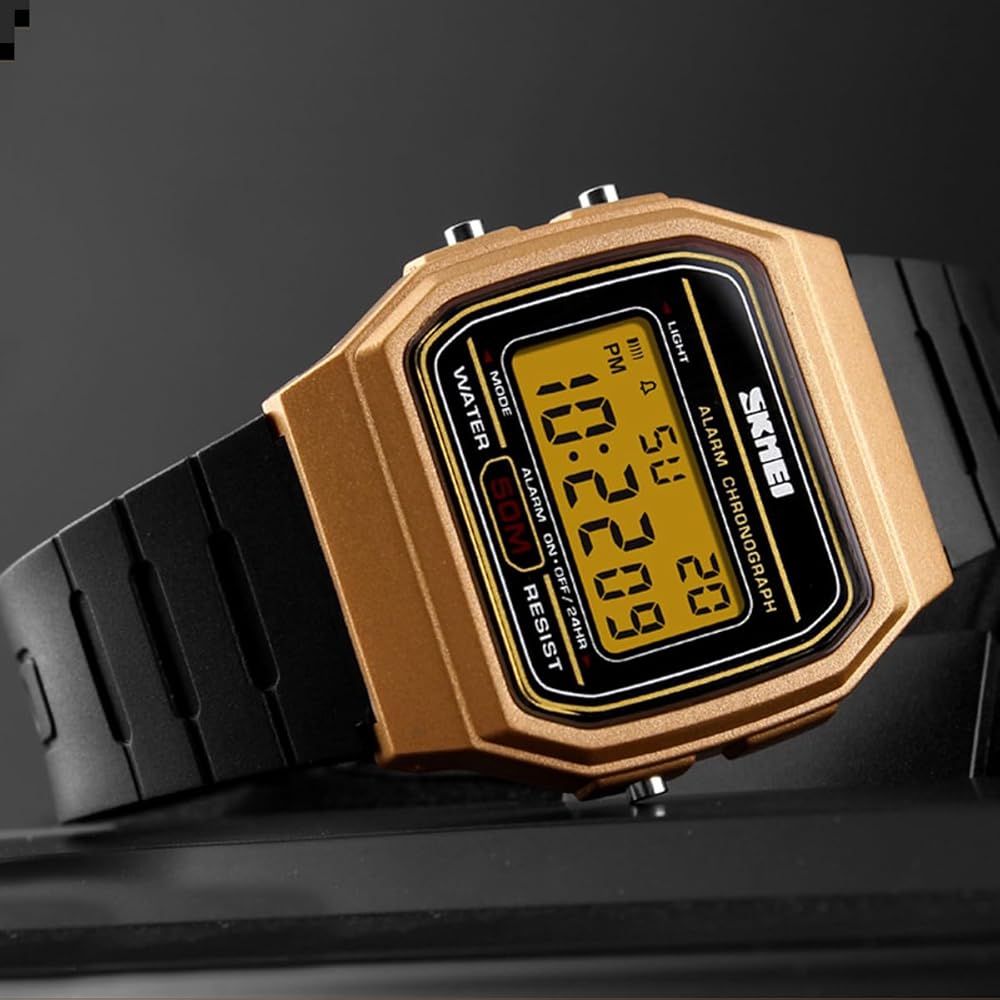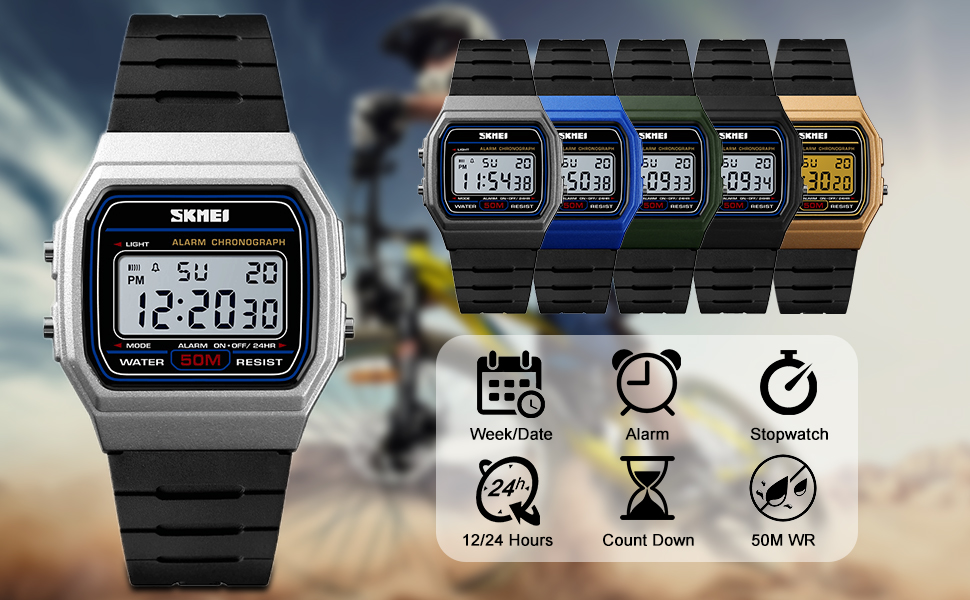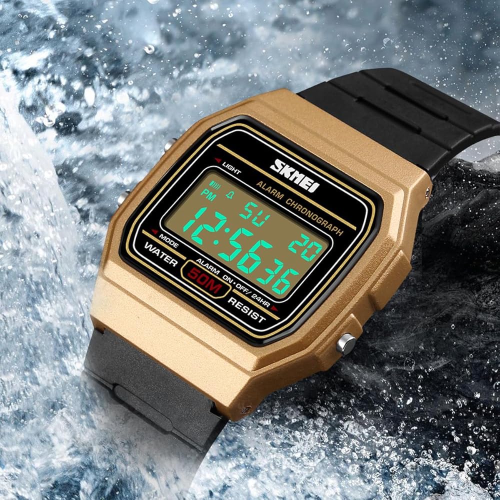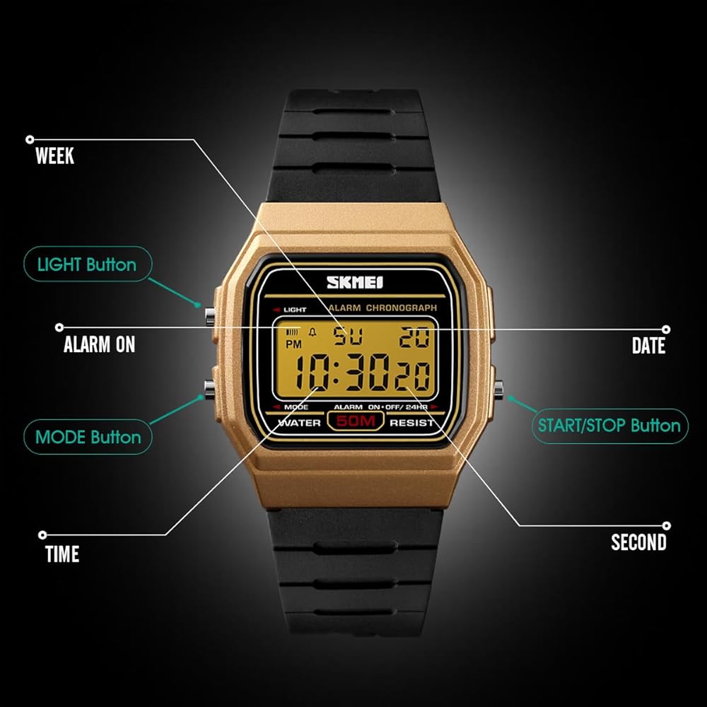 وظائف متعددة: شاشة رقمية 12/24 ساعة، التاريخ/الأسبوع، منبه يومي، إشارة وقت كل ساعة، ساعة إيقاف/عد تنازلي، إضاءة خلفية LED، مضيئة، مقاومة للماء والصدمات، مناسبة لأي رياضة للرجال.