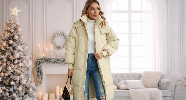 المواد: المادة ذات السطح الأملس توفر مقاومة للرياح والبرد، والبطانة محشوة بألياف البوليستر الناعمة والناعمة، مما يجعل المعطف مريحًا ودافئًا.