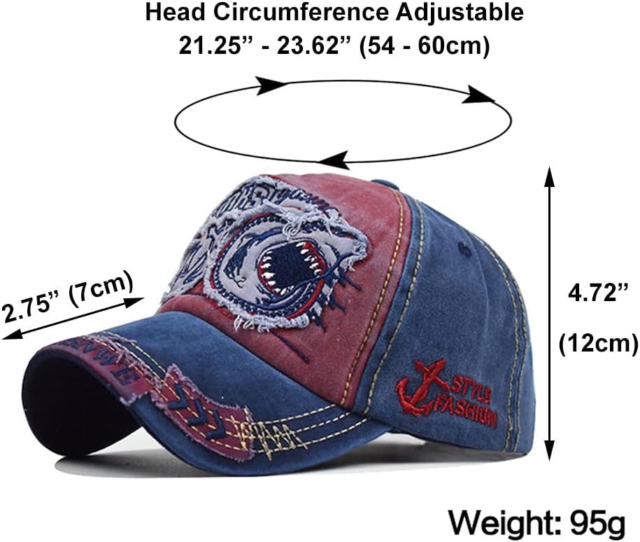 - محيط الرأس: حوالي 21.25 انش - 23.62 انش (54-60 سم)، قابل للتعديل. طول الفاتورة: 2.75 بوصة (7 سم). ارتفاع القبعة: 4.72 بوصة (12 سم)