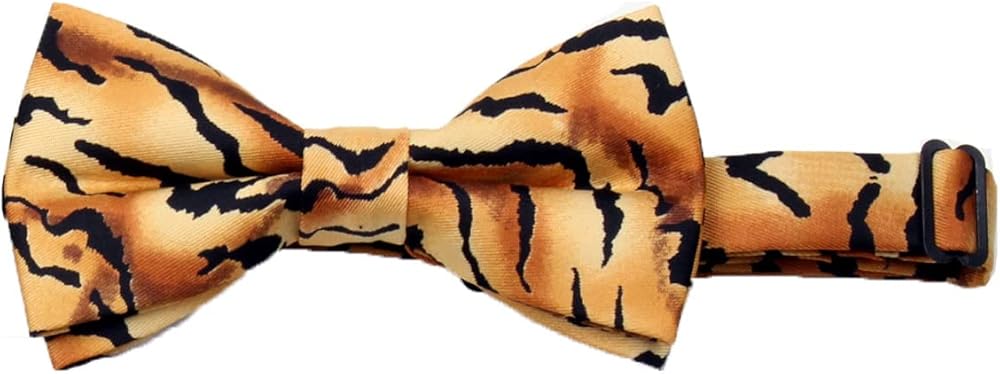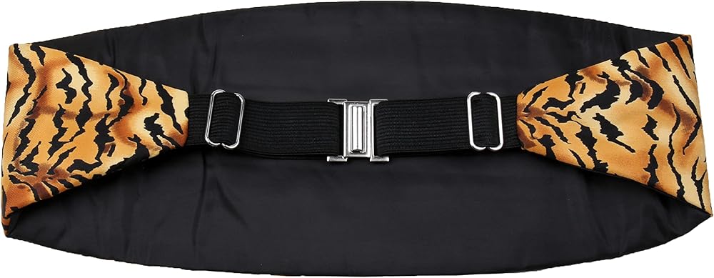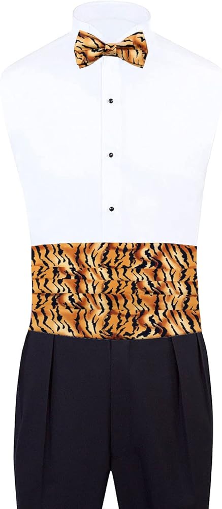 This Tiger Animal Print Cummerbund set includes a cummerbund, bow tie and hanky. This 3 piece set is made using a high grade shiny woven printed fabric which adds to the styling and fit of the cummerbund. The cummerbund has an adjustable band. The Pre-Tied Bow Tie has an adjustable strap and can fit up to a 21 inch neck and the cummerbund has 4 pleats and fits up to a 48 inch waist. Perfect for any formal occasion such as weddings, proms, winter formals, graduations and any other black tie occasions.