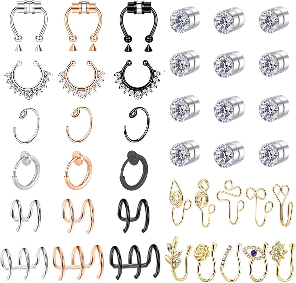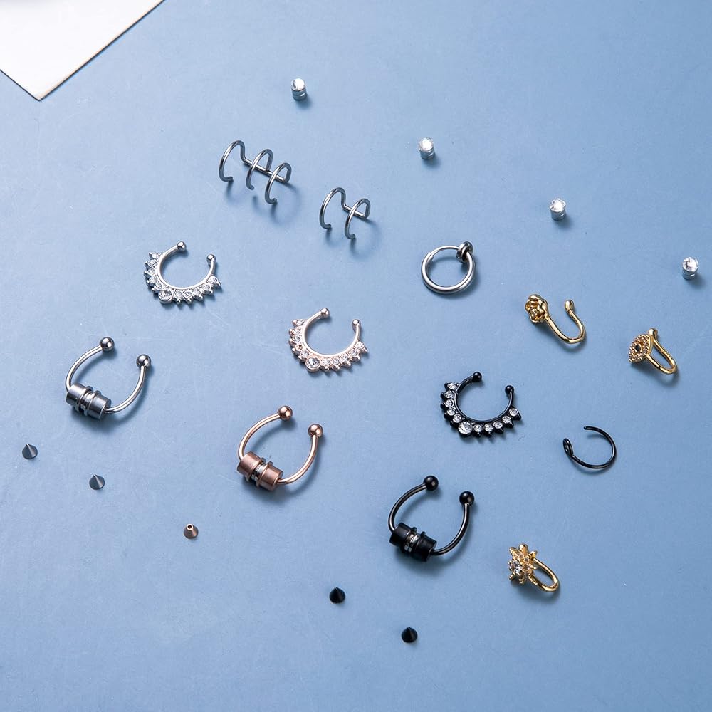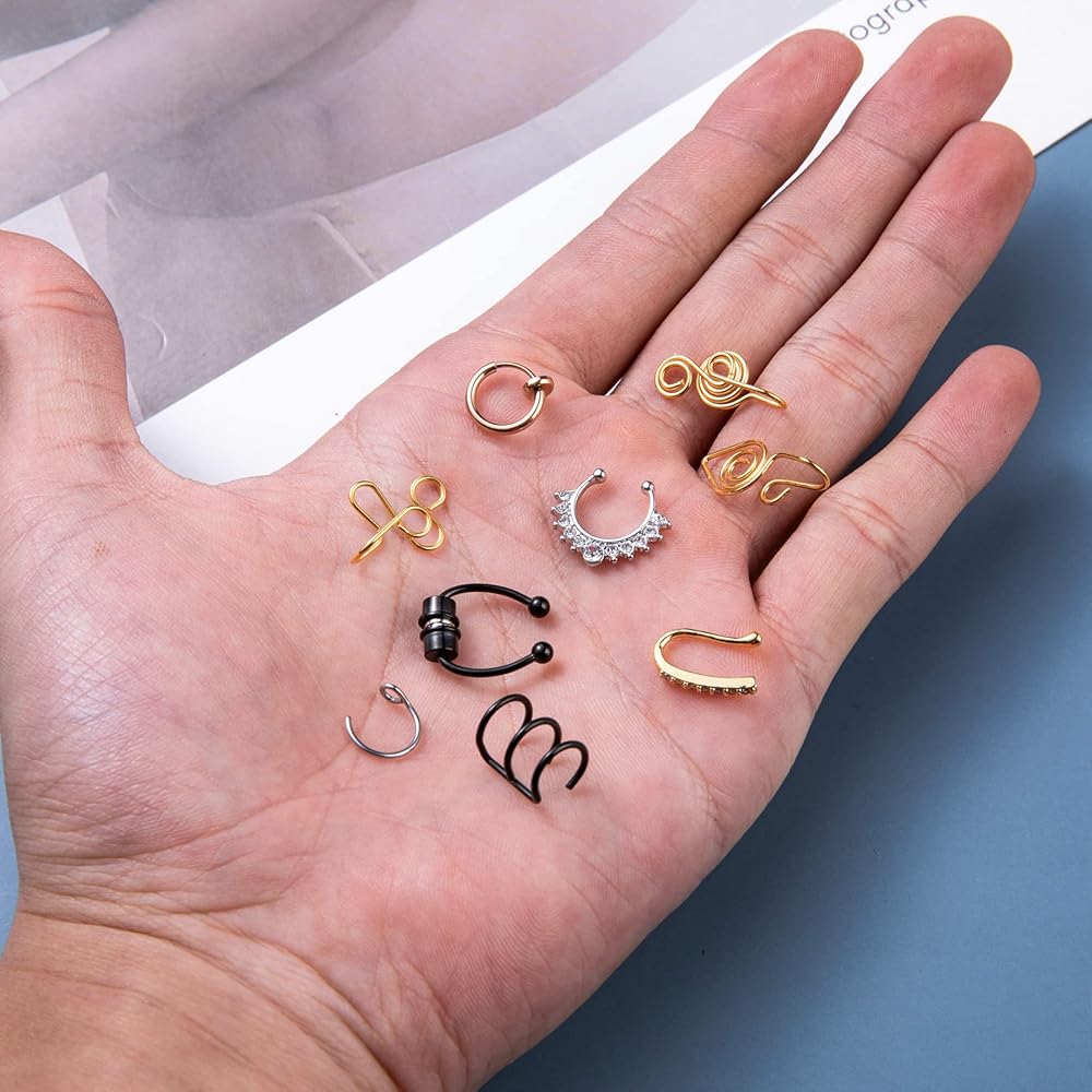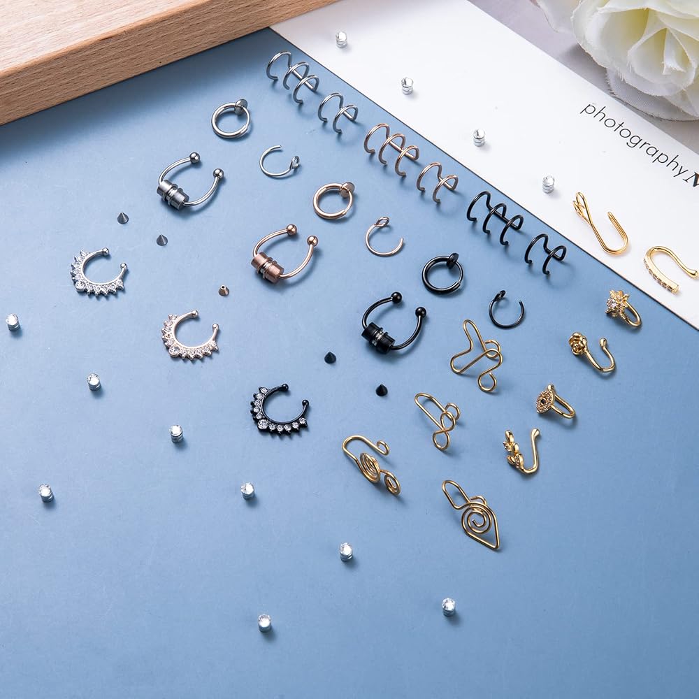 FAKE NOSE RINGS SET--One Order Includes 40Pcs Faux Nose Rings in Different Styles, 6Pcs Ear Cuffs, 6Pcs Faux Septum Rings, 6Pcs Fake Nose Rings, 6 Pairs Faux Nose Studs, 10Pcs Nose Cuffs, Varieties of Styles and Colors Provide You with Many Collocation Options.