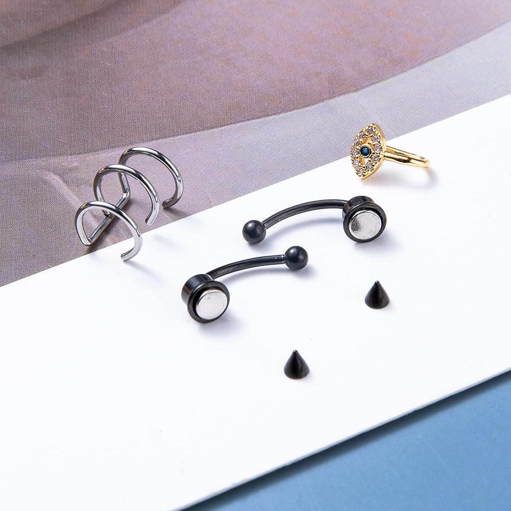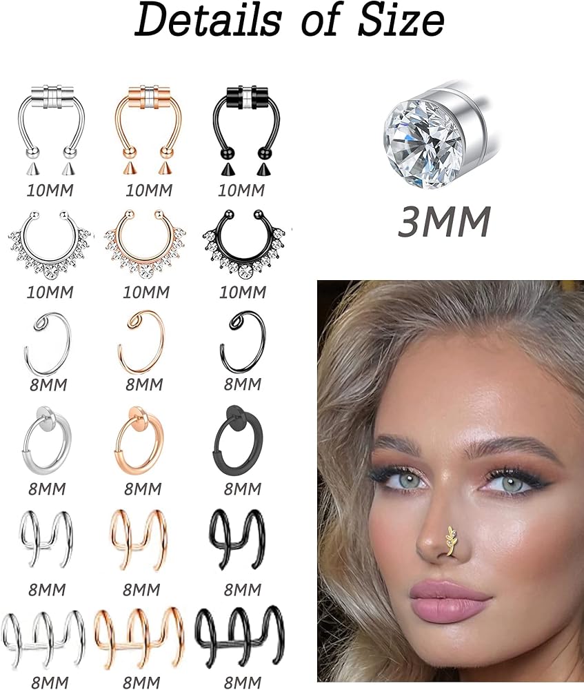 SIZE REFERENCE-- Inner Diameter of Ear Cuff: 8mm; Inner Diameter of Nose Rings: 8mm; Inner Diameter of Septum Hoop: 10mm; Nose Stud Size: 3mm. Nose Cuff Size: Adjustable According to Your Size.