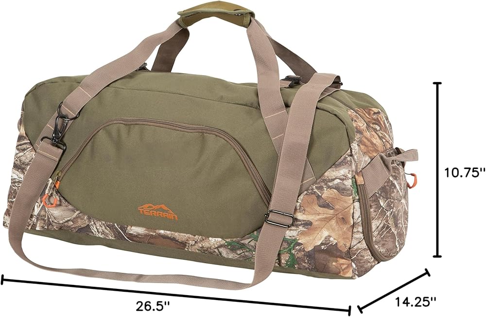 The Medium Basin Duffel Bag is a good carry-all duffel for traveling or hunting. It can be carried by the handles or shoulder strap. It has a shoe garage to keep your shoes or boots separated from other items. The Basin Duffel Bag folds up into a compact storage bag.