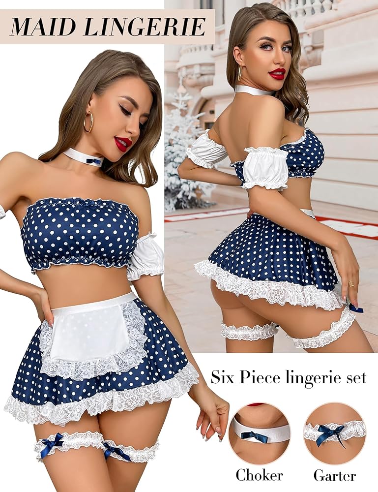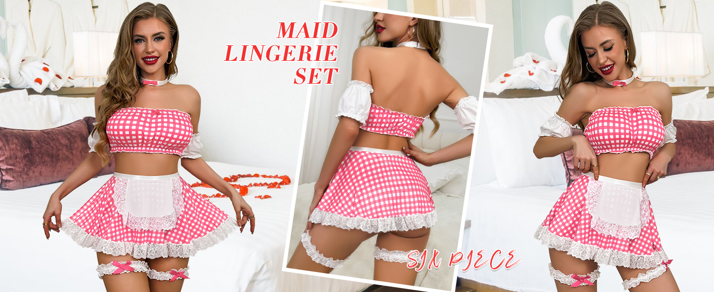 تتضمن حزمة مجموعات الملابس الداخلية ما يلي: 1 × زي خادمة مثير مع سلسلة G ومريلة، 2 × حزام ذراع، 2 × دوائر ساق مع ديكور، 1 × قطعة مجانية