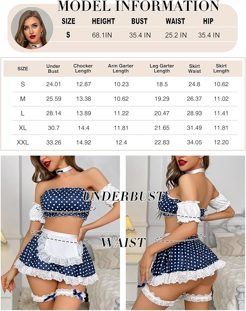 [زي الخادمة الفرنسية]: زي الخادمة للسيدات يتميز بشريطين للذراع الأبيض، وقلادة قابلة للإزالة. أعلى أنبوب كشكش المحاصيل. تنورة قصيرة عالية الخصر مع زخرفة من الدانتيل الأبيض في الأسفل، تتماشى مع اللباس الداخلي على شكل حرف G. دائرتان أبيضتان للساق، مما يجعلك جميلة وساحرة أمام حبيبك