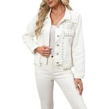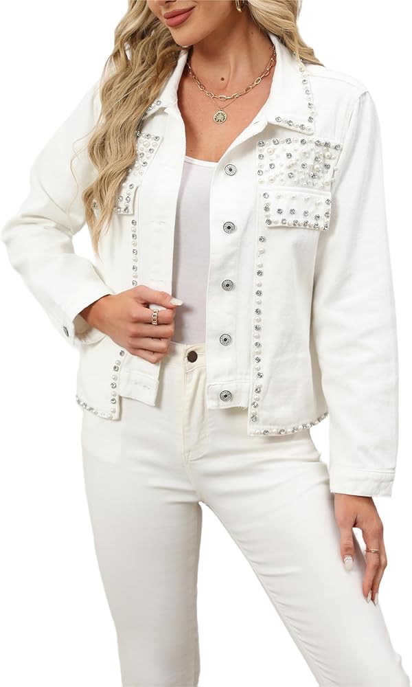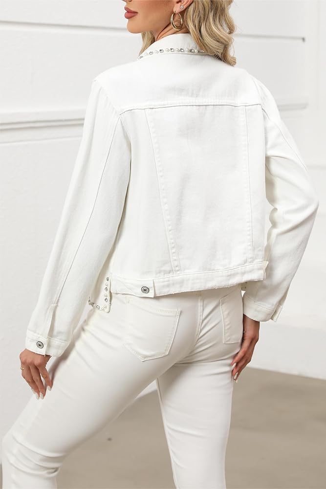 ✦【خامة عالية الجودة】: سترة الدنيم اللؤلؤية مصنوعة من نسيج خفيف الوزن وناعم، أحجار الراين مصقولة بتقنية احترافية وليس من السهل أن تسقط أو تضر الجلد