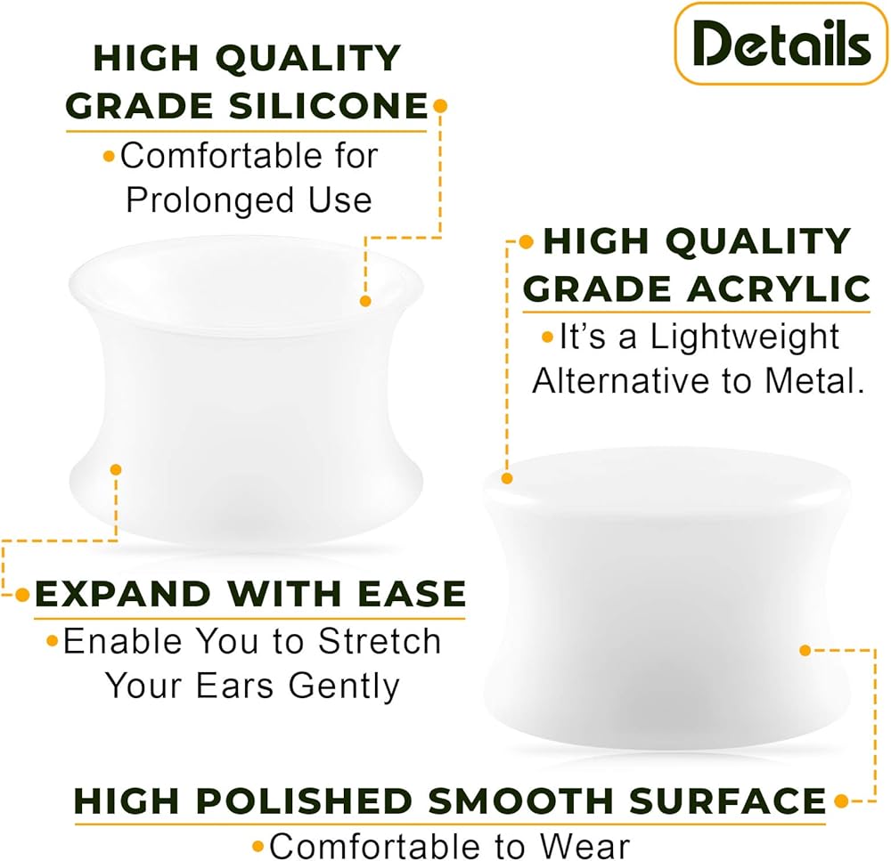 2 Pairs, A pair of White Silicone Flesh Ear Plugs . A pair of White Acrylic Piercing Ear Plugs . 4 gauge sets choices ;4g (5mm), 2g (6mm), 0g (8mm) and 00g (10mm), please choose one. Items will be packed in nice satin bag.