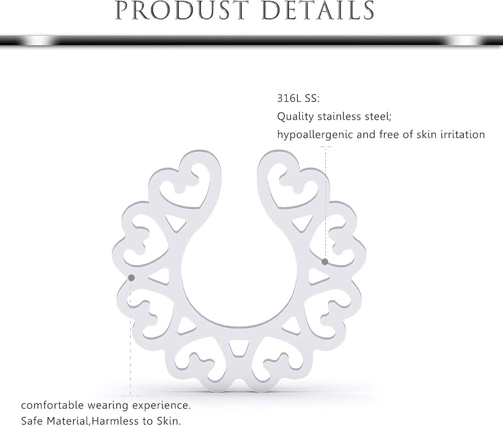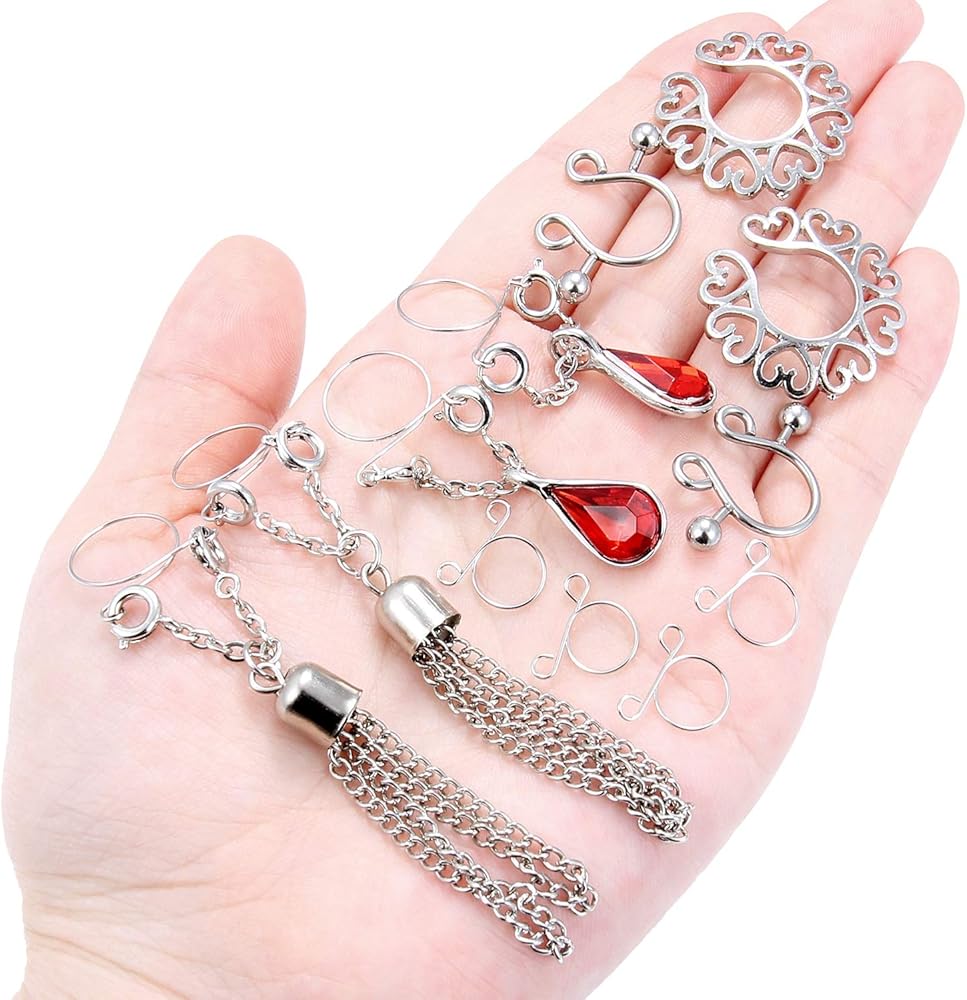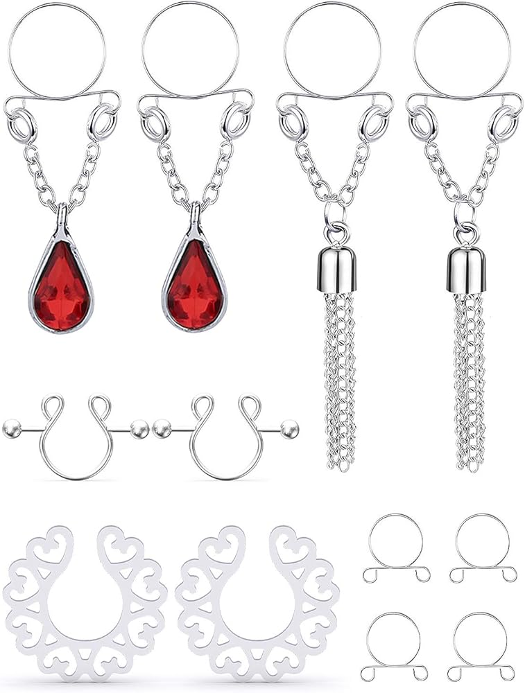 • PERFECT SET--One Order Includes 4 Pairs Fake Nipple Rings in 4 Style, 1 Pair Crystal Fake Dangle Nipplerings Piercings, 1 Pair Dangle Fake Nipple Chain Piercing, 2 Pairs Faux Nipple Rings, 2 Pairs Different Sizes Alternative Rings, Adjustable Sizes Meet Your Different Needs. Economical Women Piercing Jewelry Set.