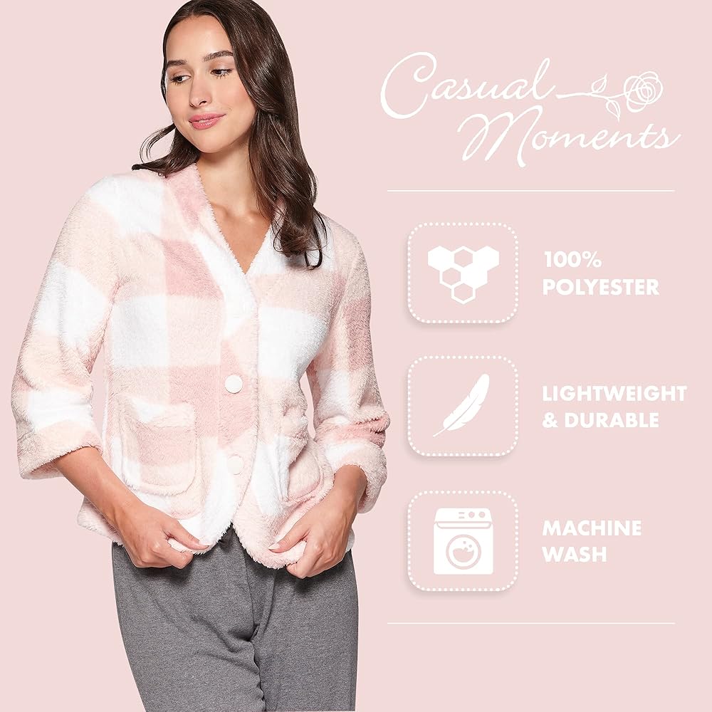 Casual Moments Women's Bed Jacket is a must have for the winter season. It's perfect to wear over your pajamas, nightgown or dress. The fabric is made from polyester and fleece which provides great warmth without the weight. This jacket features button down front, two side pockets and an elastic waistband.