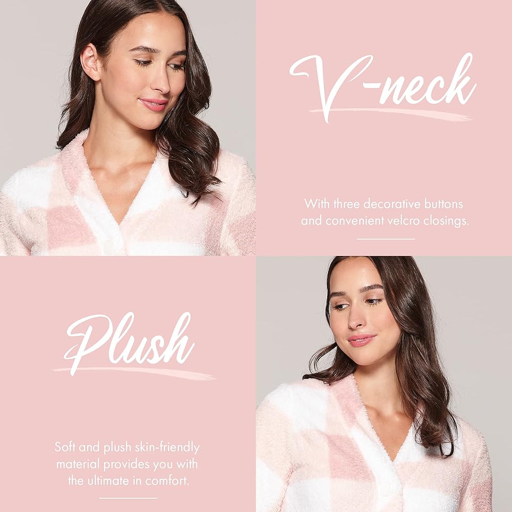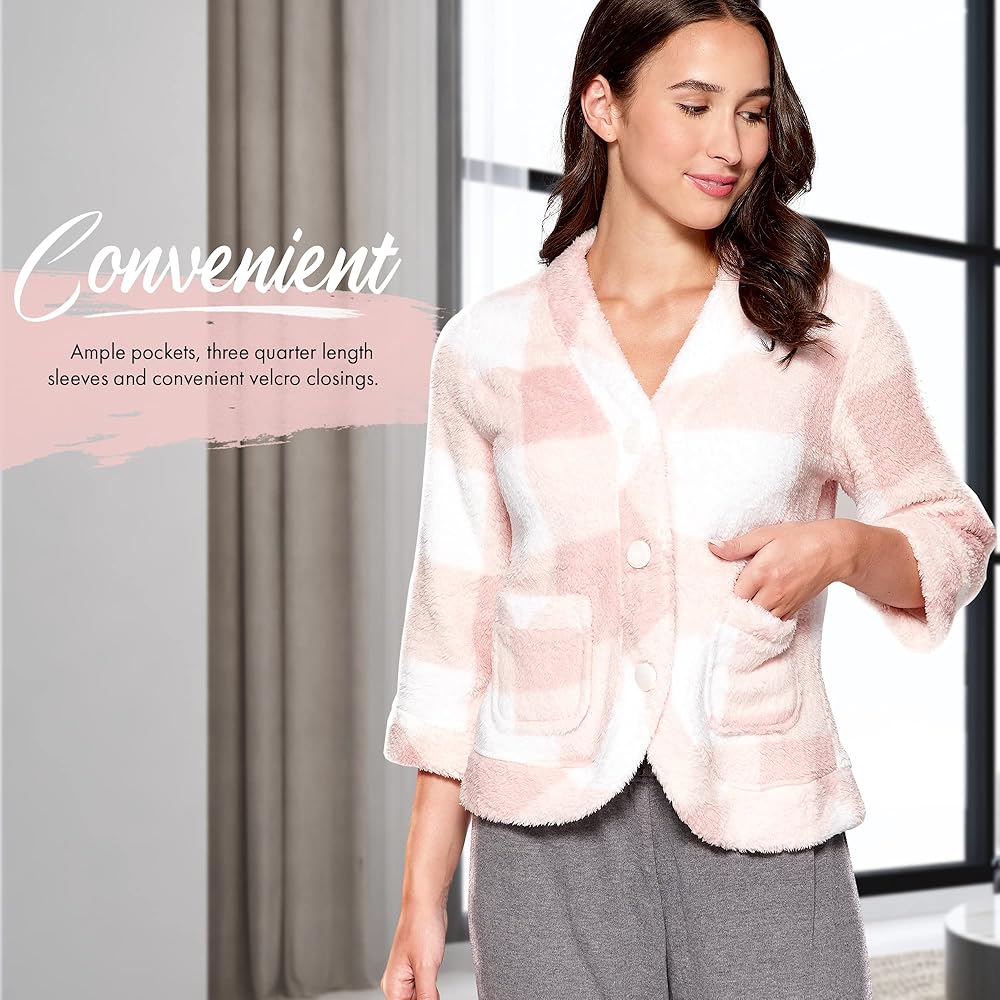 • 100% POLYESTER - Get a look that you'll love; Get your hands on this cozy, lightweight fleece bed jacket and the compliments won't stop! Wear it over your favorite pajamas or nightgown for an easy, relaxed style; You'll love how this feels against your skin.