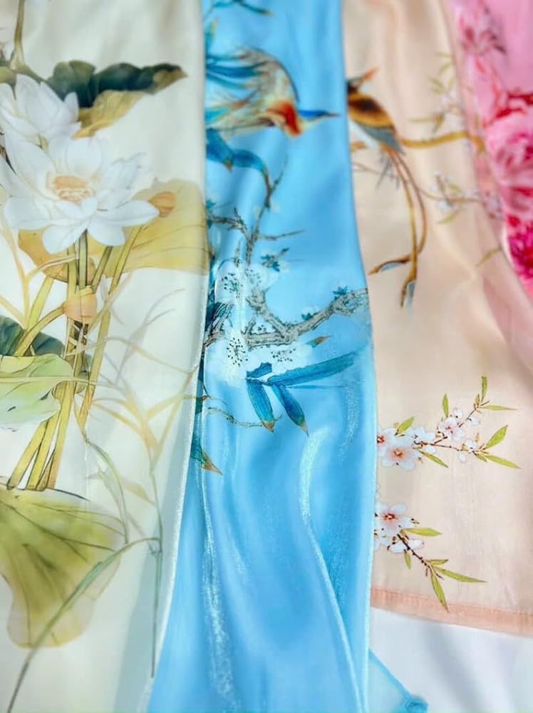 طقم شيفون آو داي بطبعات لوتس الربيع | الفيتنامية الحديثة المعدة مسبقًا آو داي| السنة القمرية الجديدة