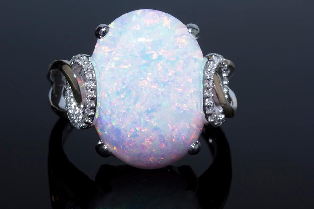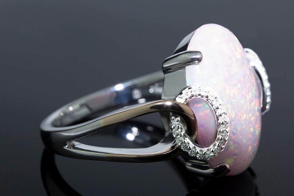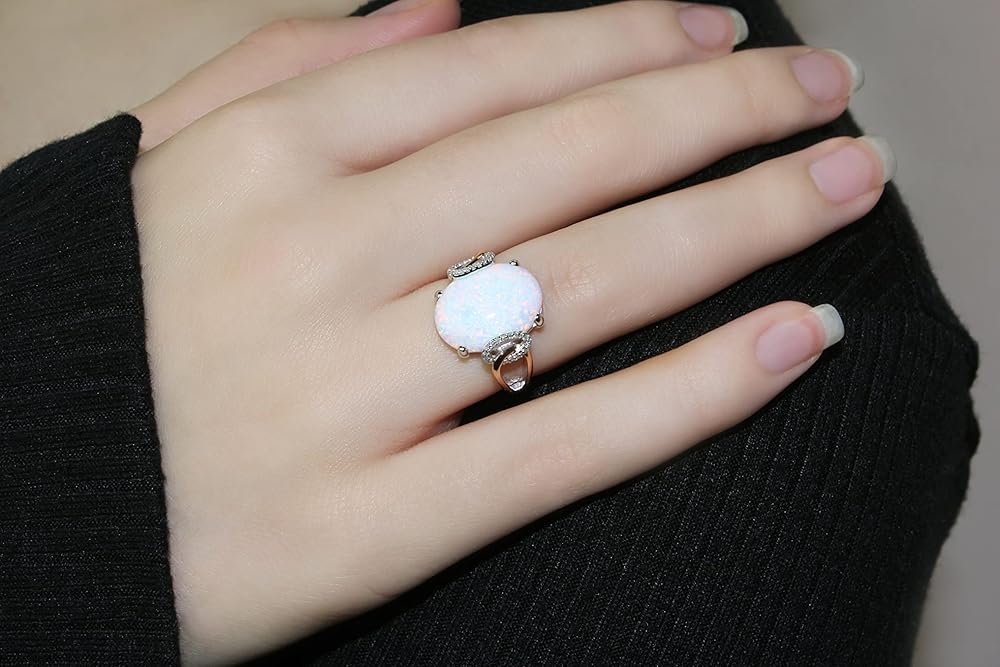 دائمًا على الموضة - من المؤكد أن هذا الخاتم المتطور والأنيق سيرفع مجموعة مجوهراتك. يتميز خاتم الذهب الوردي عيار 10 قيراط مع الفضة الإسترلينية عيار 925 بكابوشون بيضاوي مصنوع في مختبر من الأوبال الأبيض في إطار من أربعة شقوق تتمركز بين شكلين بيضاويين مرصعين بالماس يتصلان بشريط ساق منقسم من الذهب الوردي عيار 10 قيراط. هذا النمط المذهل هو كنز خالد ستستمتع بارتدائه كل يوم.