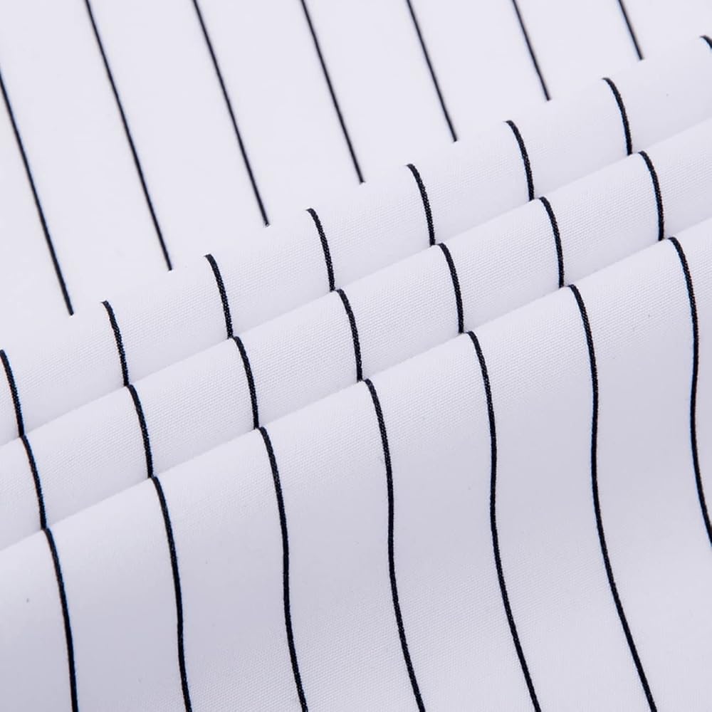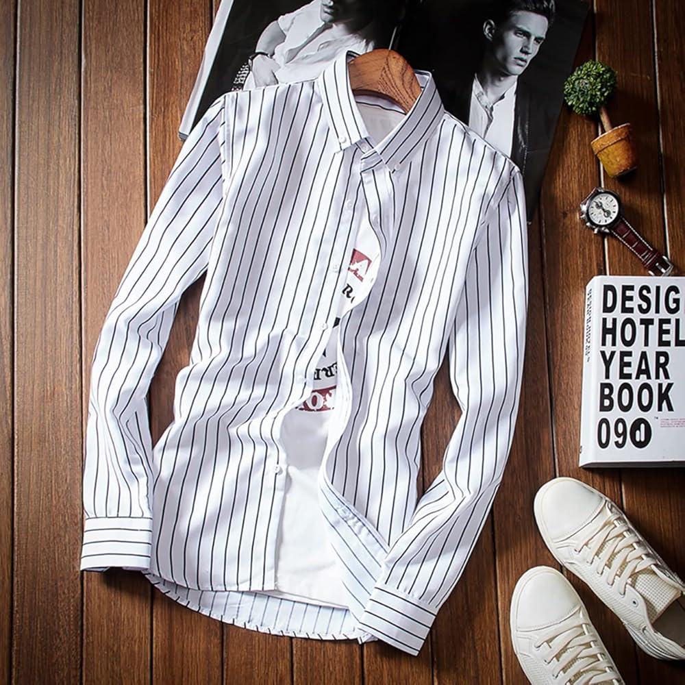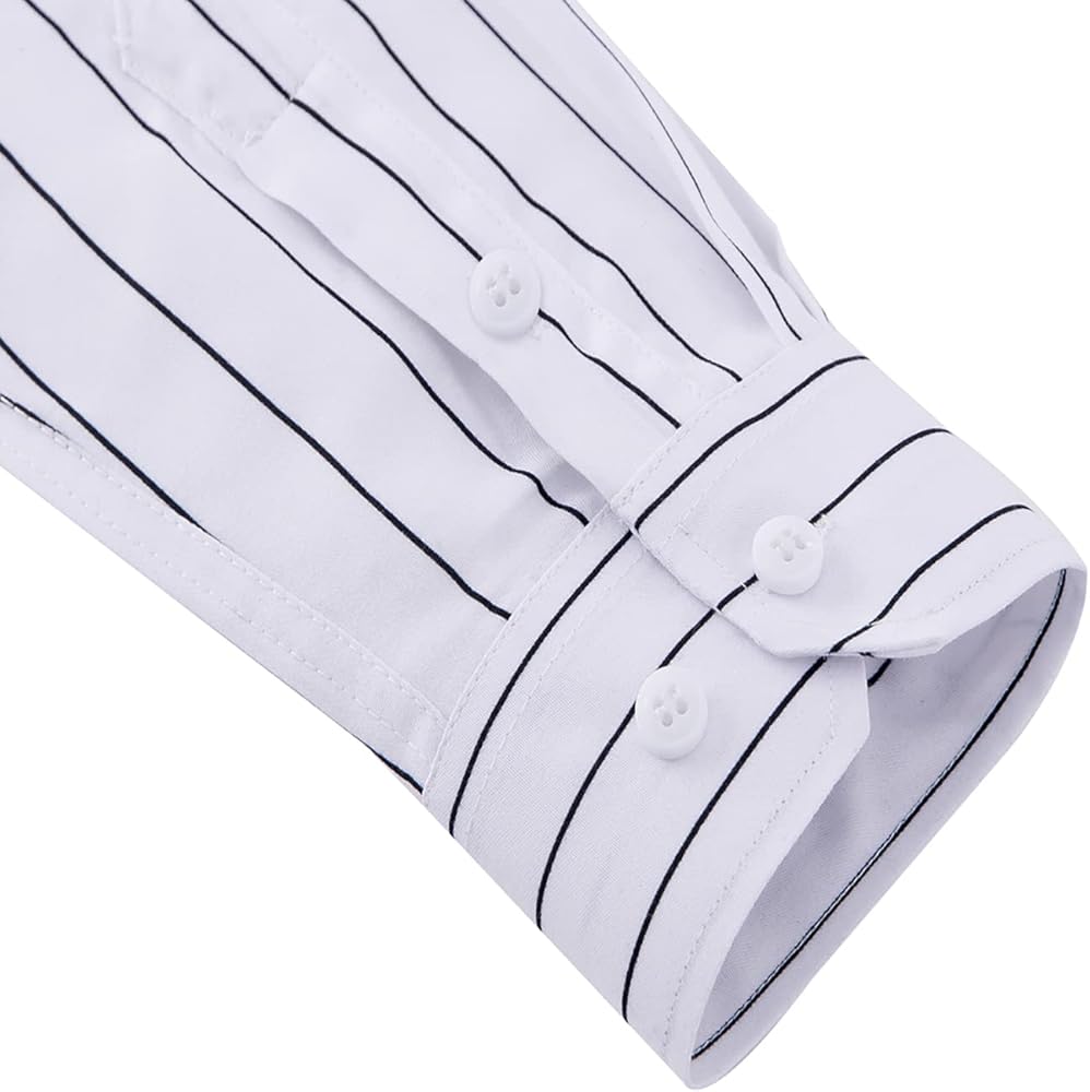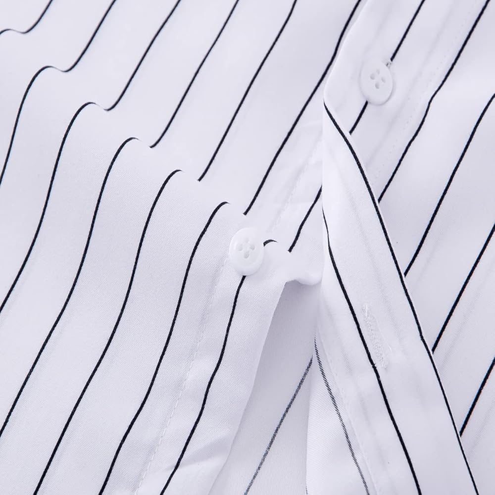 النمط: قمصان بأكمام طويلة للرجال من QWQUOO، قصة ضيقة، نمط مطبوع مخطط عمودي، أساور فرنسية مزدوجة، إغلاق بأزرار أسفل، ياقة مطوية للأسفل، أساور فرنسية مزدوجة، حاشية ذيل قميص منحنية مستديرة