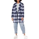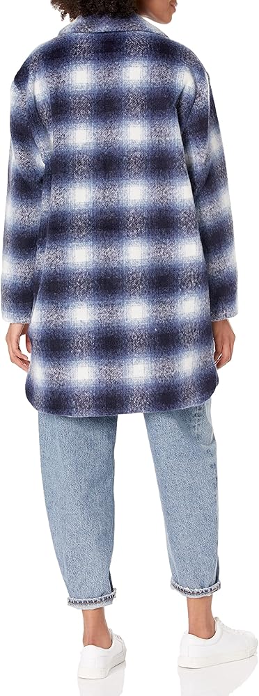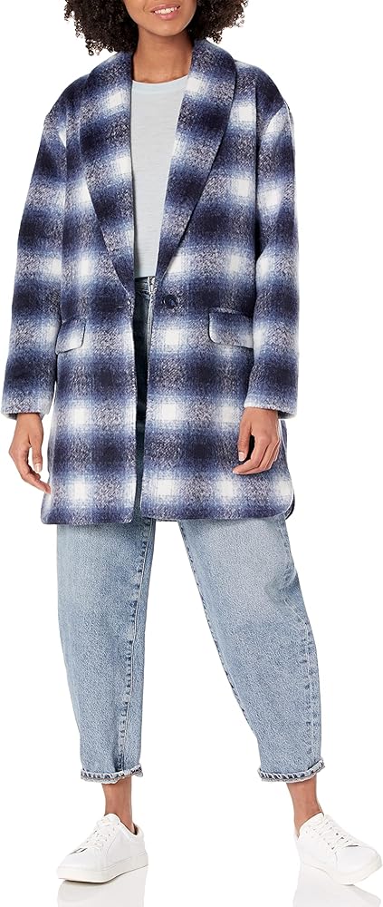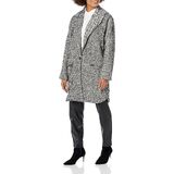 The Zoey Jacket is a sophisticated, knee-length herringbone coat with front pockets and a wide lapel.