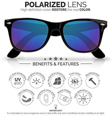 • كن أكثر استرخاءً كل يوم - تأتي هذه النظارات الشمسية مع عدسات مستقطبة وايفارير الأعلى تصنيفًا قمنا باختبارها بمرور الوقت. يقلل الاستقطاب من الوهج المنعكس بواسطة المرايا أو المواد اللامعة أو المصقولة أو أي نوع آخر من انعكاس أشعة الشمس. ستشعر براحة عينيك بشكل دائم لأنك لن تحدق بعد الآن! سواء كنت تقود سيارتك إلى العمل أو تمشي في الحديقة أو كنت تستمتع بحمام شمس لطيف على الشاطئ، ستكون أقل تعبًا في نهاية اليوم لأن عينيك أكثر استرخاءً.