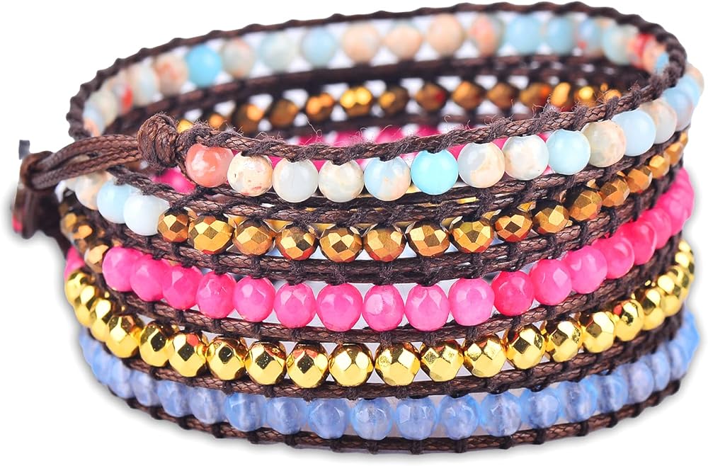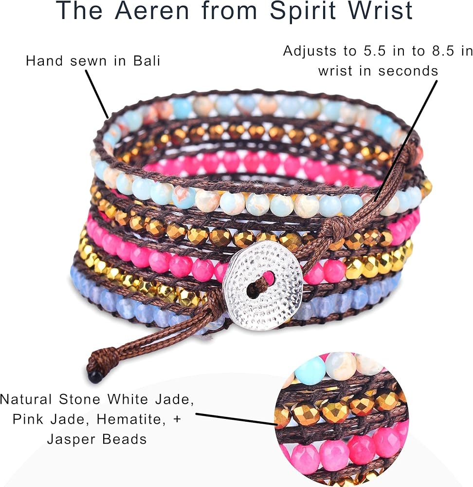 سوار المعصم ايرين من سبيريت للمعصم من اليشم الأبيض والوردي، والهيماتايت والياسبر بوهو مصنوع يدويًا في بالي. أساور المعصم سبيريت مصنوعة من أحجار كريمة حقيقية من أجل سوار مثالي للنساء، مجوهرات السوار الملفوف بالخرز للنساء. تم خياطة سوار ايرين بوهو الملفوف يدويًا من اليشم الأبيض والوردي، والهيماتيت والياسبر وحبل بني بقياس 33 بوصة أو 89 سم. يناسب المعصم من 5 بوصة إلى 8.5 بوصة أو المعصم من 12 سم إلى 22 سم. احصل على مجموعة محولات بمقاس مثالي مجانًا.