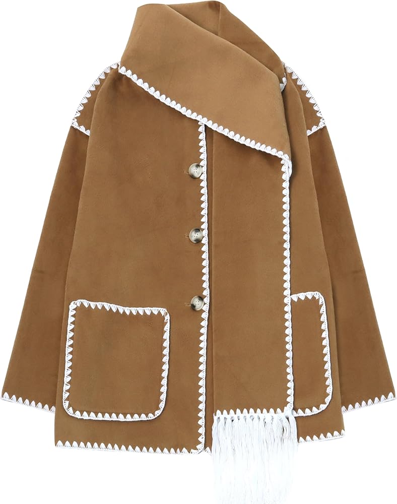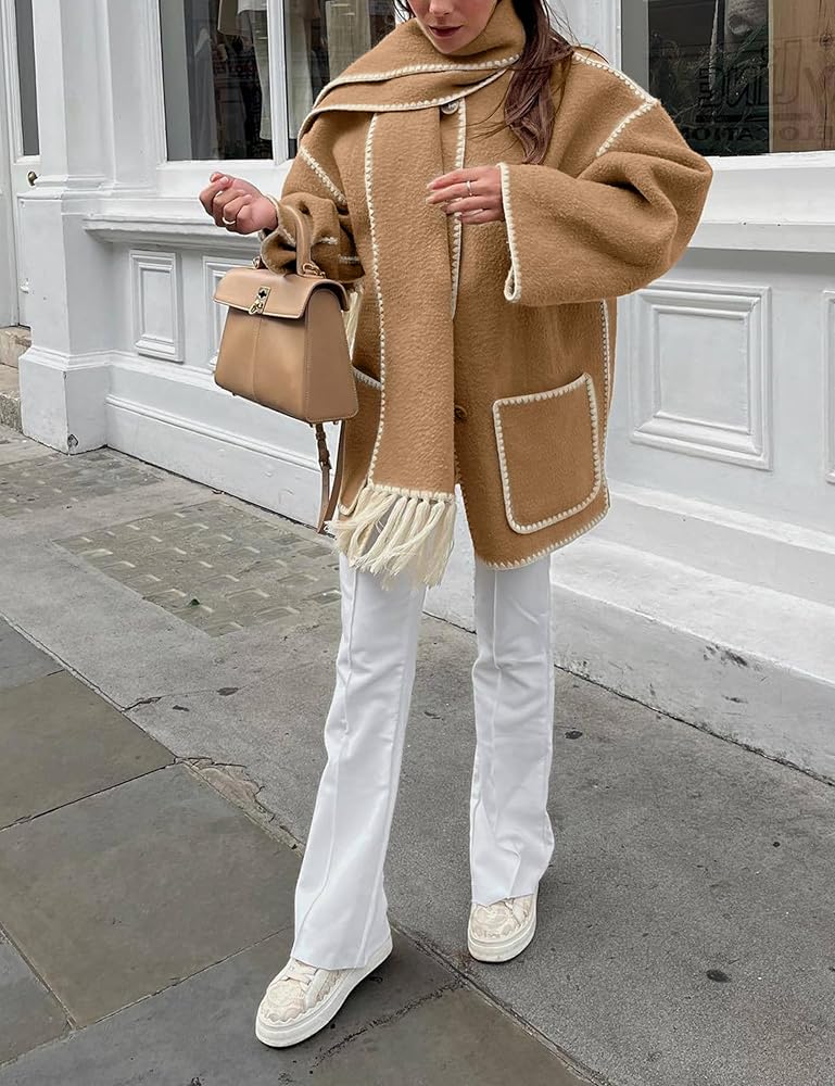 سترة وشاح مطرزة للنساء من SeekMe معطف كبير الحجم من مزيج الصوف بأزرار سفلية ملابس خارجية شتوية مع وشاح شرابة (1818-CamelX1-L-FY)