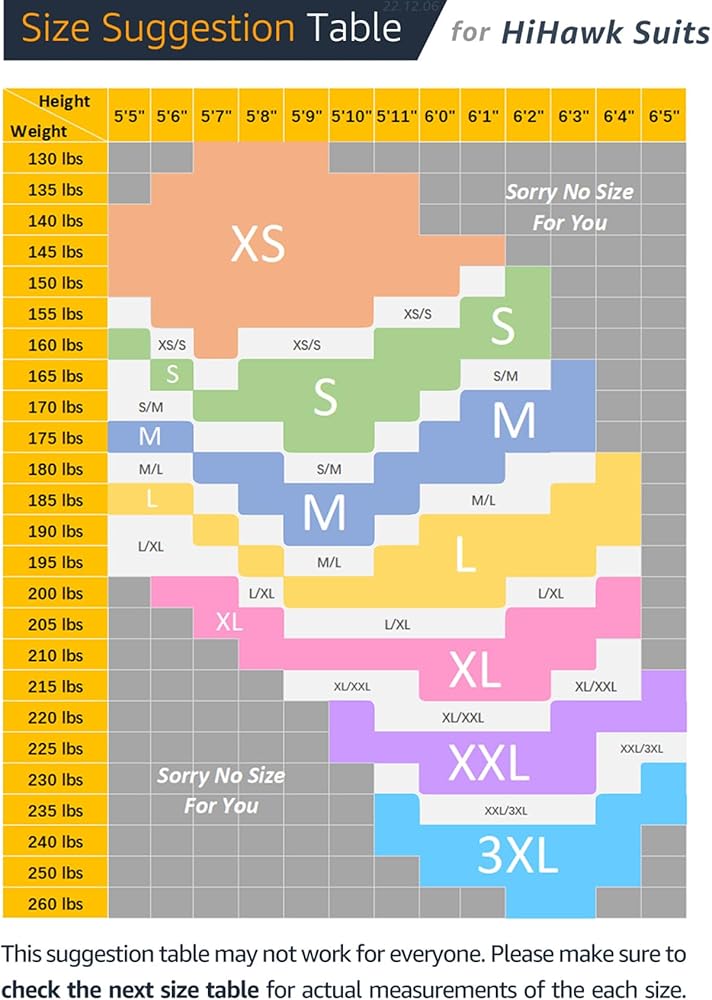 اختيار المقاس: يرجى الرجوع إلى جدول مقاسات Hihawk الموجود في صورنا (وليس صور أمازون). يعد الطول والوزن ومحيط الصدر والخصر من القياسات الأساسية المطلوبة، وإذا أمكن، فيرجى السماح لعائلتك أو أصدقائك بمساعدتك في قياس جسمك وإخبارنا بأننا سنحدد المقاس المناسب لك تمامًا.