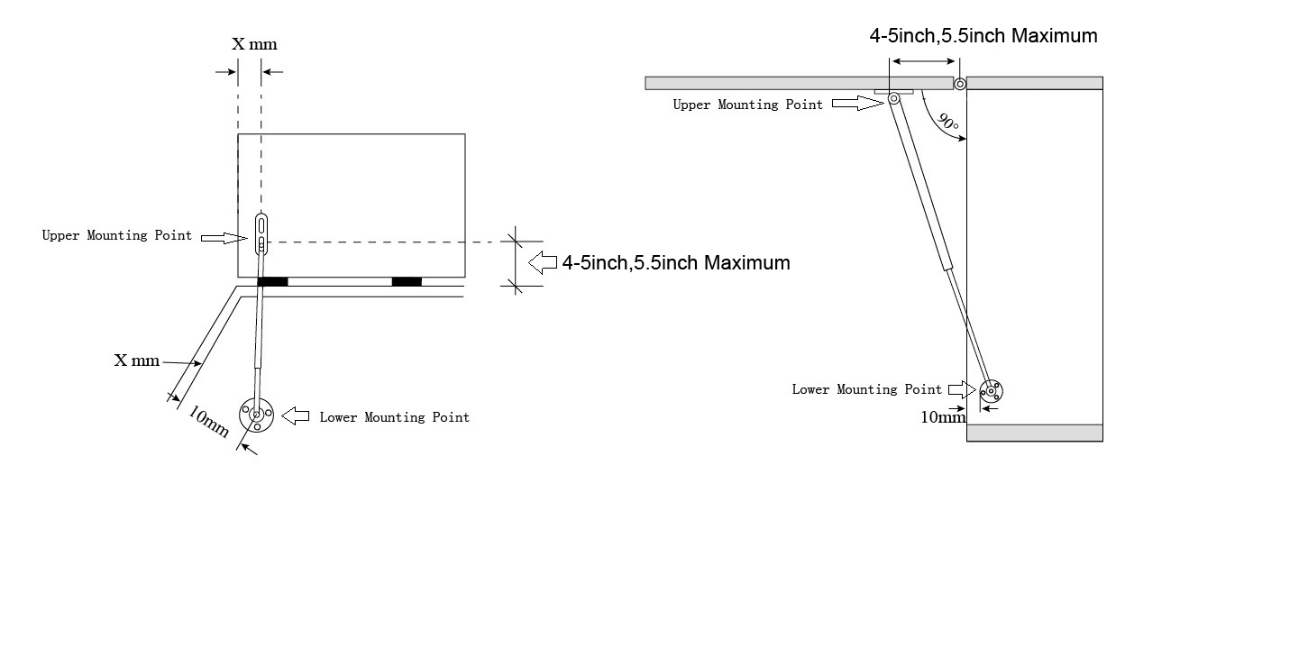 إذا كنت تريد فتح الغطاء عند 90-120 درجة، فإن نقطة التثبيت على الغطاء تكون عند 120-130 مم (4.72-5.12 بوصة) إلى اتجاه المفصل. إذا كنت تريد فتح الغطاء في أكثر من 120 درجة، فإن نقطة التثبيت على الباب تكون في 75 مم (2.95 بوصة) إلى اتجاه المفصلات إذا كنت تشعر بقوة جدًا، يمكنك تحريك نقطة التثبيت 20 مم (0.79 بوصة) نحو اتجاه المفصل، في حين تشعر بقوة جدًا، يمكنك تحريك نقطة التثبيت 20 مم (0.79 بوصة) نحو اتجاه المفصل، إذا كنت تشعر أنه ضعيف، فيمكنك تحريكه 20 مم (0.79 بوصة) باتجاه الاتجاه المعاكس
