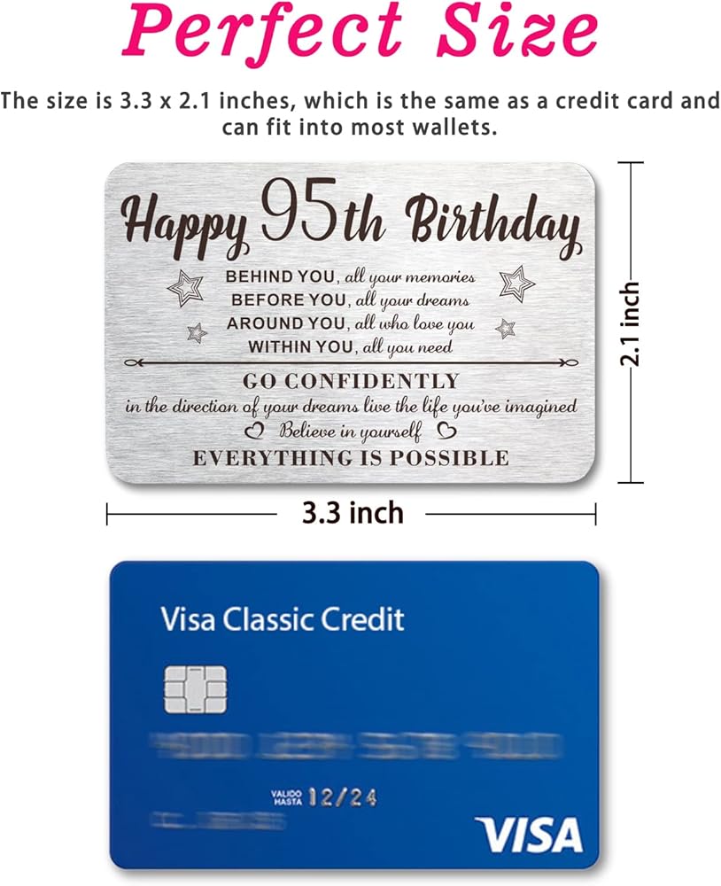 [95 year old women men gift ideas]:Permanent engraved wallet card laser engraved with :Happy 95th birthday behind you all your memories before you all your dreams around you all who love you within you,all you need go confidently in the direction of your dreams live the life you've imagined believe in yourself everything is possible .