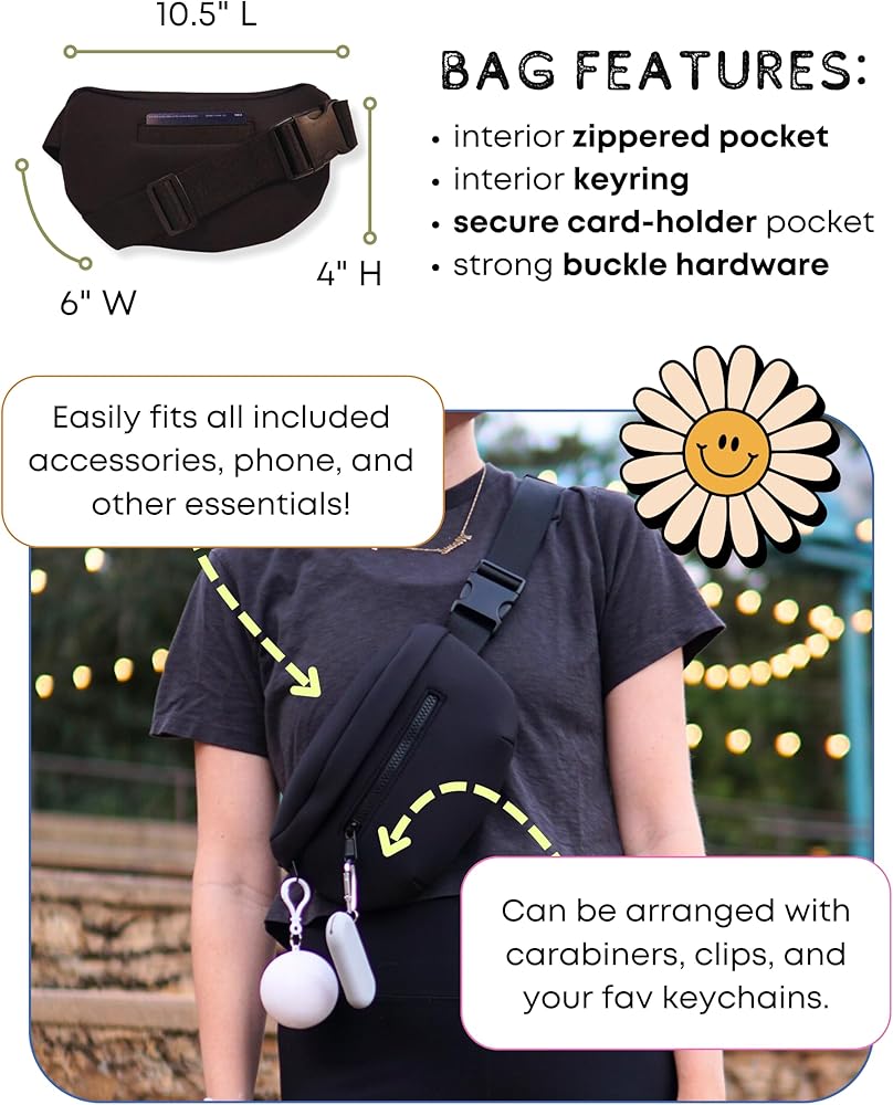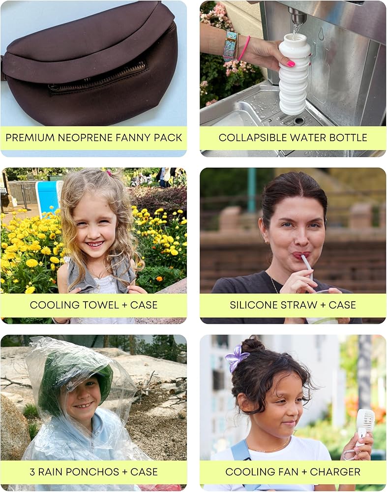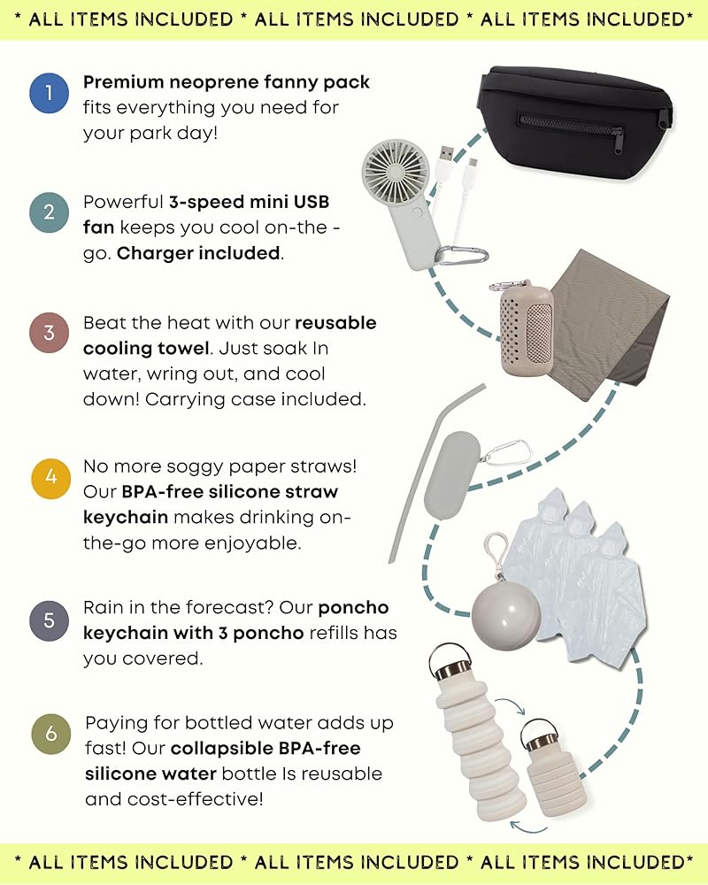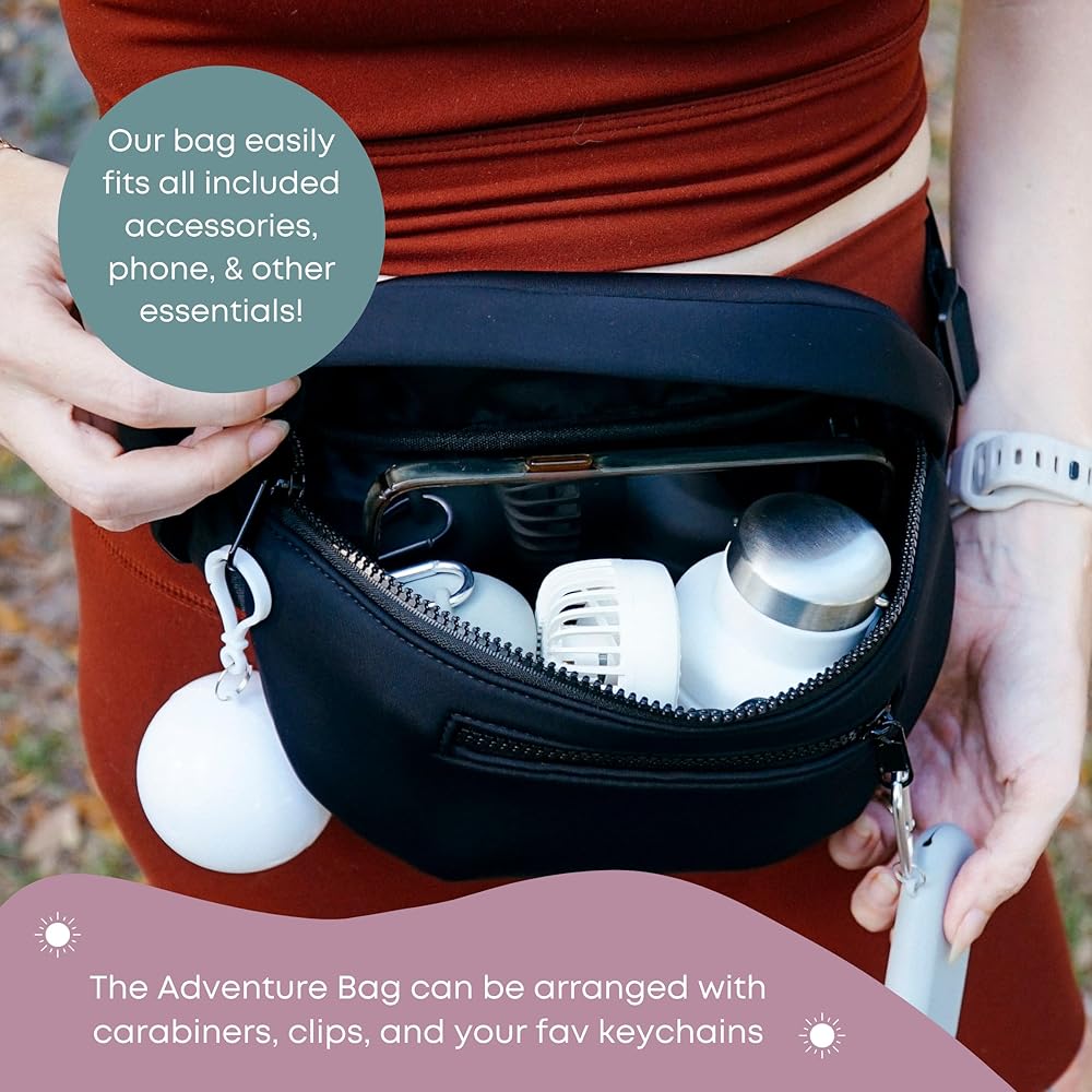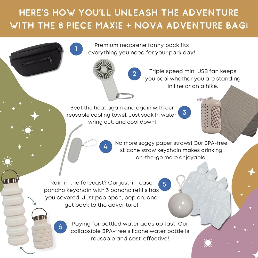 Introducing the Maxie + Nova Adventure Bag – your go-to companion for effortless excursions! Designed to maximize the moment and minimize packing hassles, this water-resistant neoprene bag and travel necessities including a portable USB fan, silicone water bottle, cooling gym towel, one size fits most poncho keychain, and silicone straw with keychain and cleaner. Our aensures stress-free adventures. Featuring three zippered compartments and a built-in key clip, it keeps the included traveling essentials neatly organized, eliminating the need for rummaging. Customize your setup with the included carabiners and key clips to match your unique style. Tailored with travel essentials for women, men, and children in mind, this game-changing Adventure Bag is perfect for any journey, offering accessibility and organization for your day at the amusment park, beach, summer vacation, hiking, music festivals, or even sporting events. Elevate your style confidently all day long with all your mini travel essentials in place. Maxie + Nova makes ideal travel gifts for women and men alike, with 4 stylish colors to choose from to fit any style. Embrace the summer vibe with this versatile bag that complements seasonal adventures. More than an accessory, the Maxie + Nova Adventure Bag is a necessity for seamless and stress-free travel. Adventure awaits – grab yours now and make every moment count!