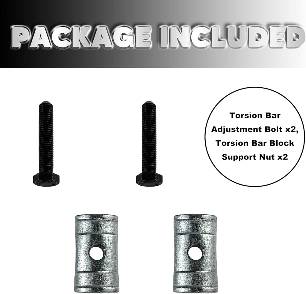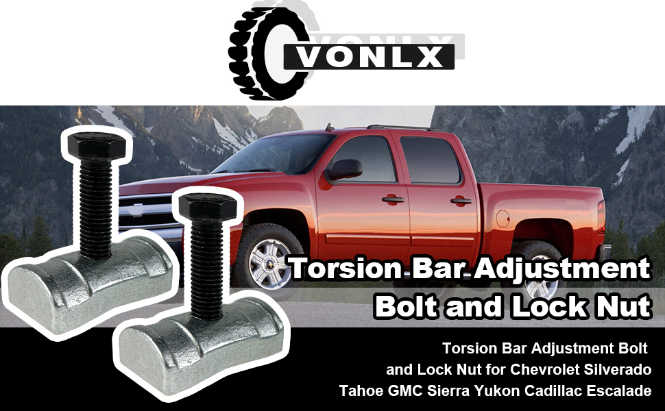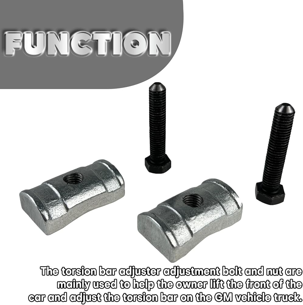 [الوظيفة] يستخدم مسمار تعديل قضيب الالتواء وصمولة بشكل أساسي لمساعدة المالك على رفع الجزء الأمامي من السيارة وضبط قضيب الالتواء على شاحنة سيارة جنرال موتورز.