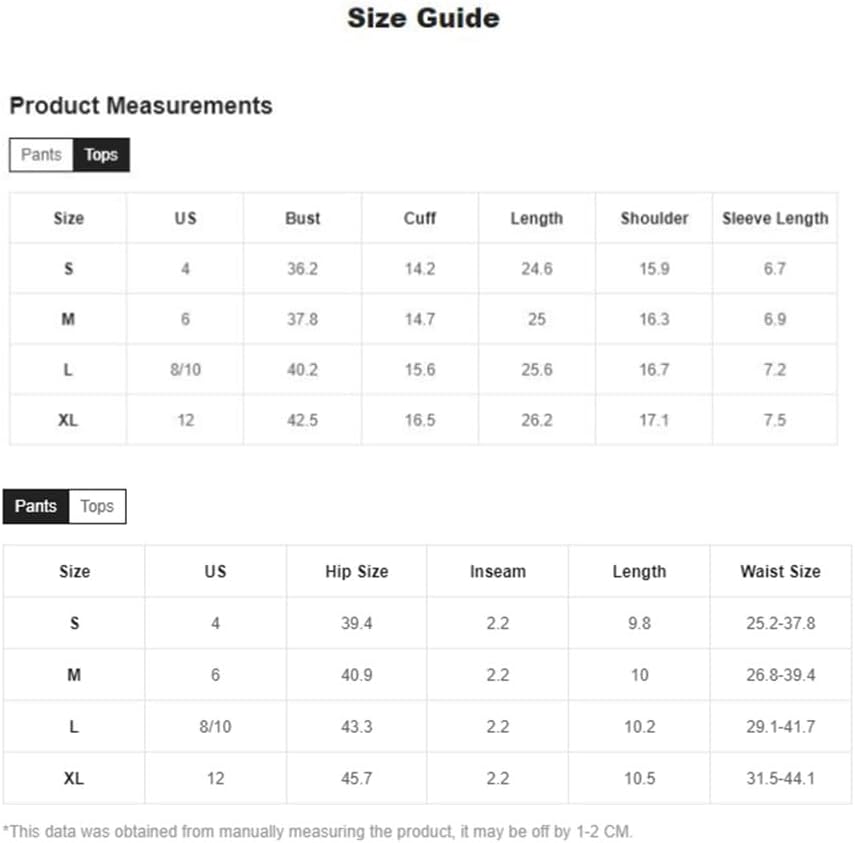 Small: Bust: 36.2", Cuff: 14.2", Top Length: 24.6", Shoulder: 15.9", Sleeve Length: 6.7", Hip Size: 39.4", Inseam: 2.2", Shorts Length: 9.8", Waist Size: 25.2-37.8"
