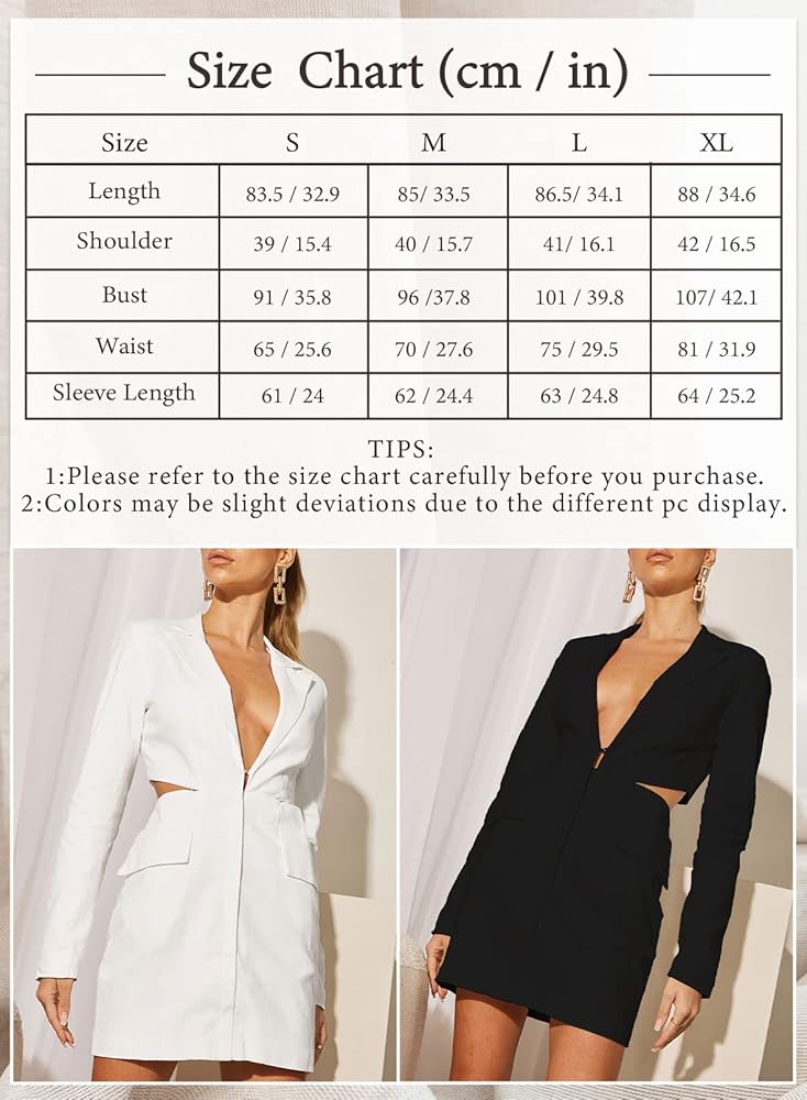 فستان بليزر ميني: رقبة عميقة على شكل حرف V، وياقة طية صدر السترة، ووسادة كتف، وفتحة للخصر الخلفي، ولون ثابت، وإغلاق بخطاف وعين في الأعلى، وفساتين بليزر باستخدام سحاب للإغلاق.