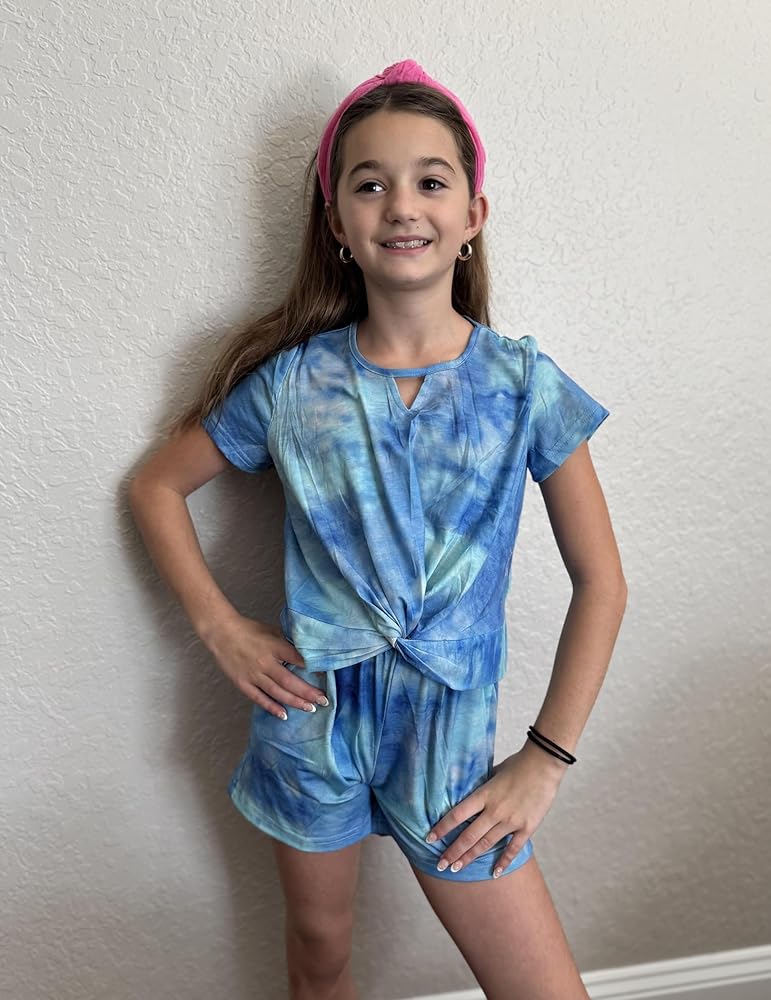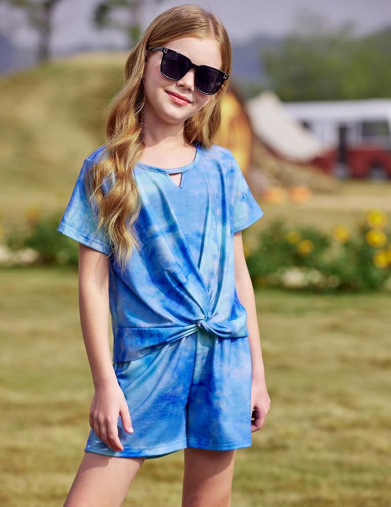 Arshiner الفتيات الصيف 2 قطعة ملابس التعادل صبغ مجموعات قصيرة عارضة تويست الجبهة كم قصير قمم وبنطلون مع جيوب