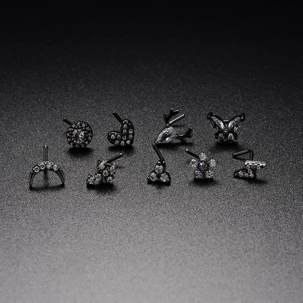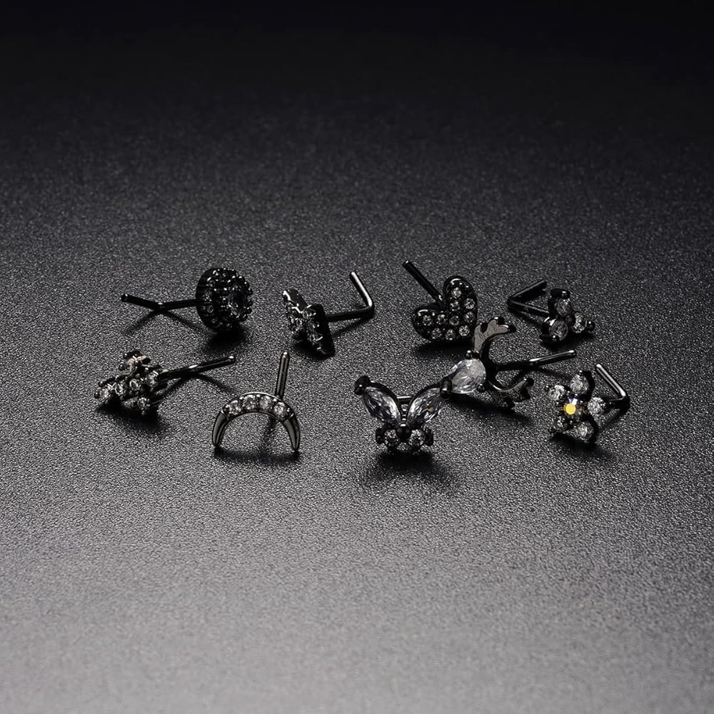 مسامير أنف سوداء - 9 قطع 20 جرام حلقات مسامير أنف سوداء مع تشيكوسلوفاكيا متلألئة. تأتي مجموعة حلقات الأنف هذه بأشكال مختلفة، بما في ذلك الصليب والفراشة والبرق والقمر والقلب والزهرة والدائرية والمثلث والغزال. خيارات متعددة لتلبية احتياجاتك المتنوعة، تألق لثقب أنفك.