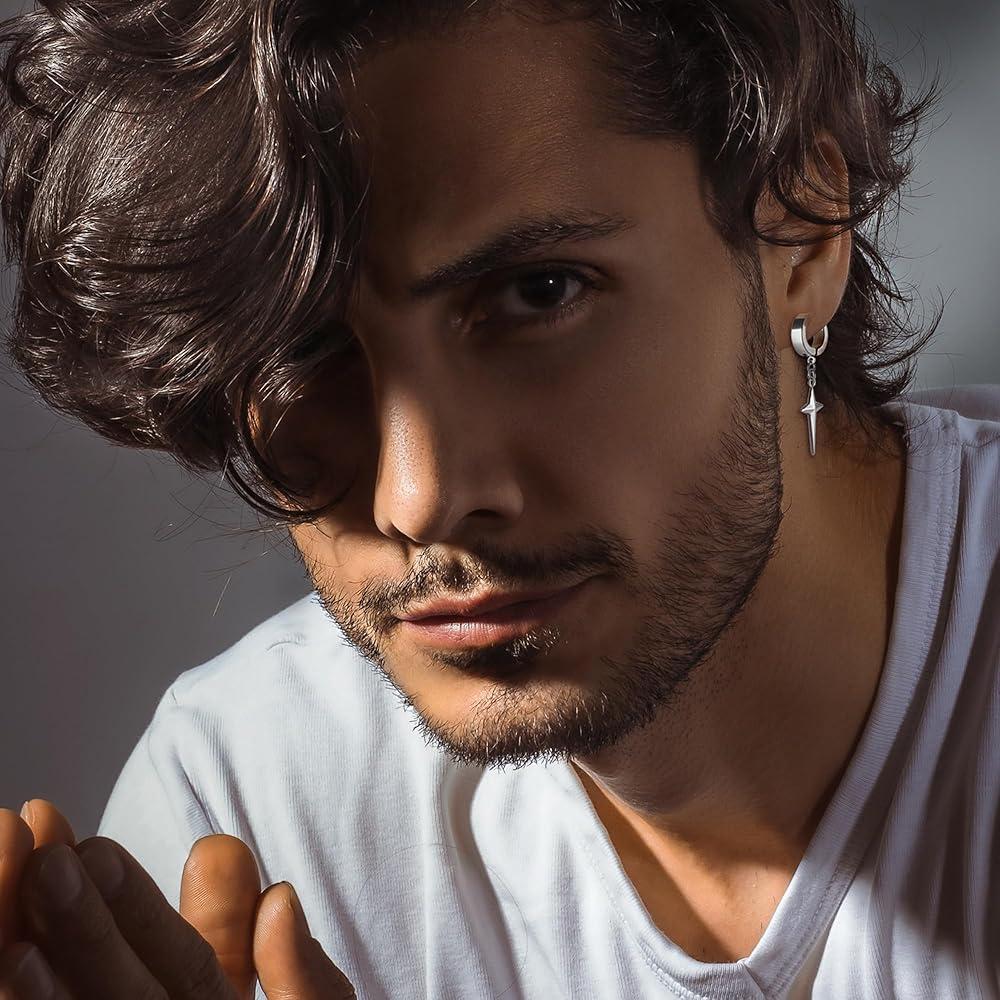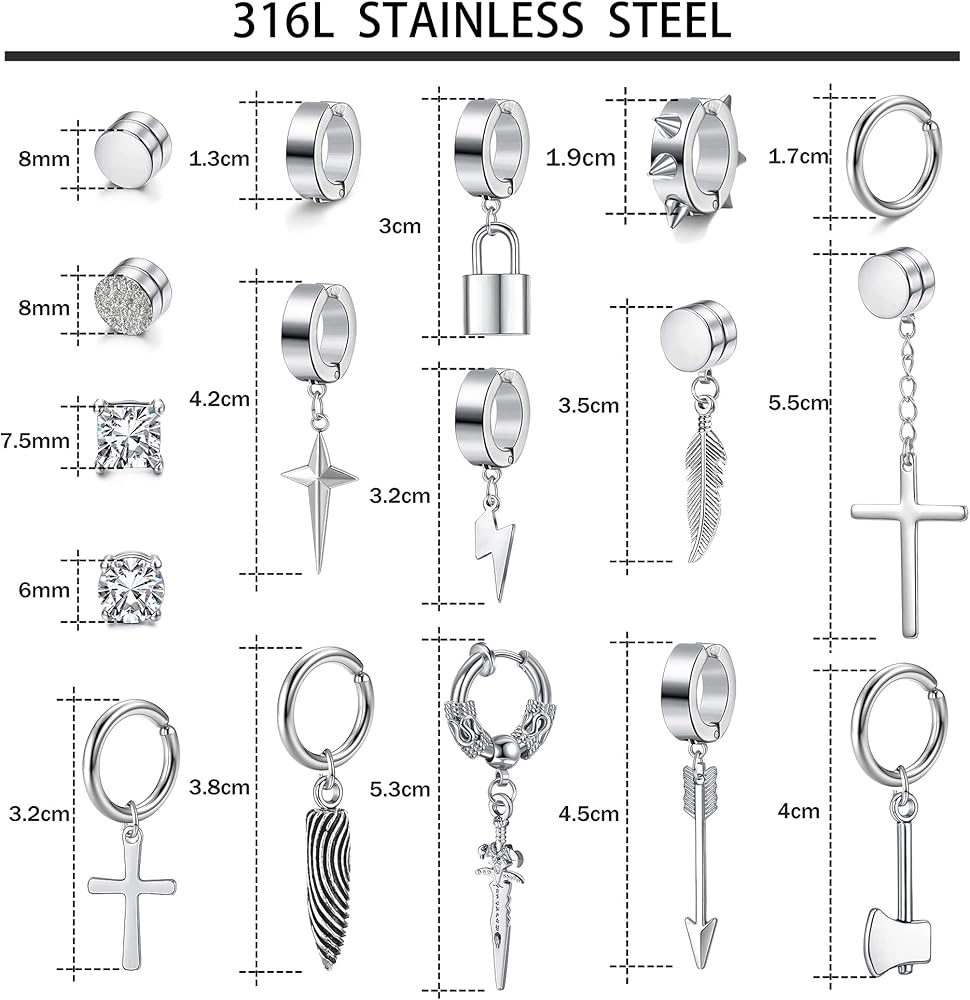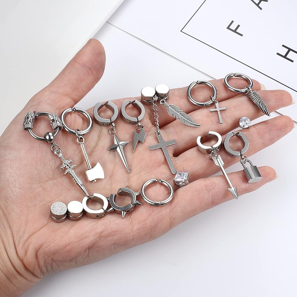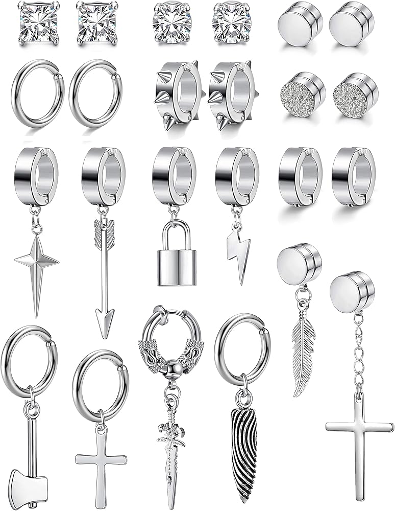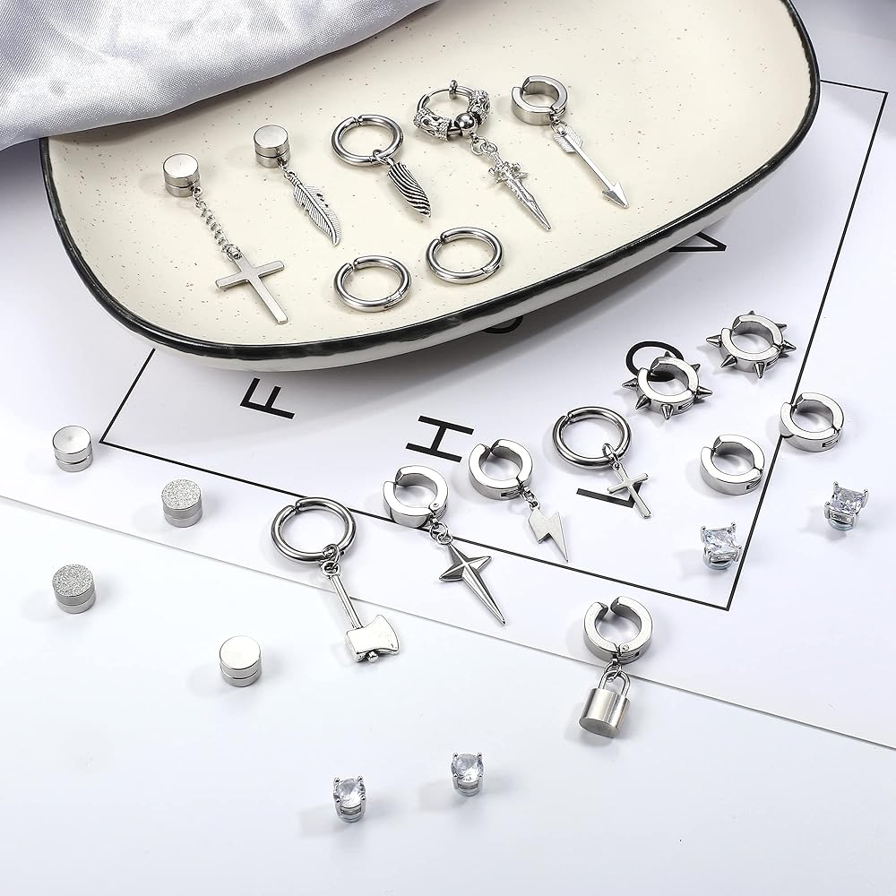 CLIP EARRINGS MENS:You will get 24 pcs cool fake earrings set including 5 pairs Magnetic hoop earrings inlaid CZ,3 pairs punk clip on earrings and 8 pcs cross chain dangle earrings non pierced.The stylish and classic design perfectly show your personality and style.