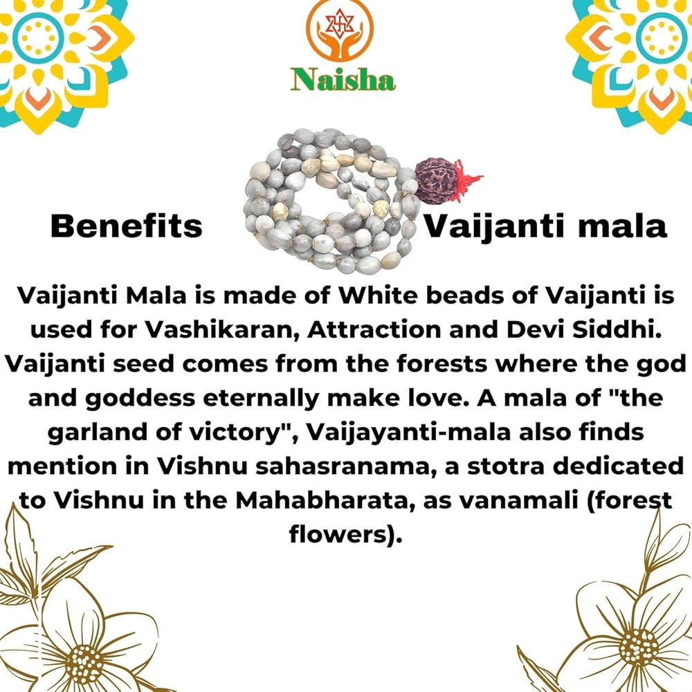 ✅ فايجانتي مالا مصنوع من الخرز الأبيض من فايجانتي يُستخدم في فاشيكاران والجذب وديفي سيدهي. تأتي بذور فايجانتي من الغابات حيث يمارس الإله والإلهة الحب إلى الأبد. مالا من النصر. Vaijayanti هو أحد هذه الأعشاب الإلهية التي يتم تقديم أزهارها وبذورها وأكاليلها إلى آلهة مختلفة في الهندوسية.
