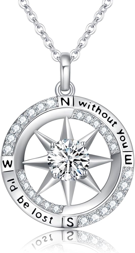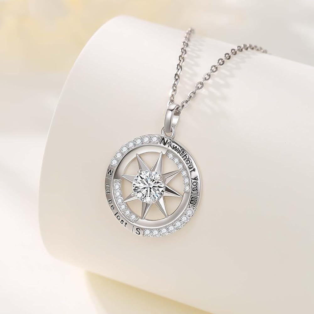 AOSAIB Compass Necklace S925 Sterling Silver I'd Be Lost Without You Diamond Compass Pendant Graduation Gift Compass Jewelry Valentine Birthday Gift for Girlfriend Wife Her