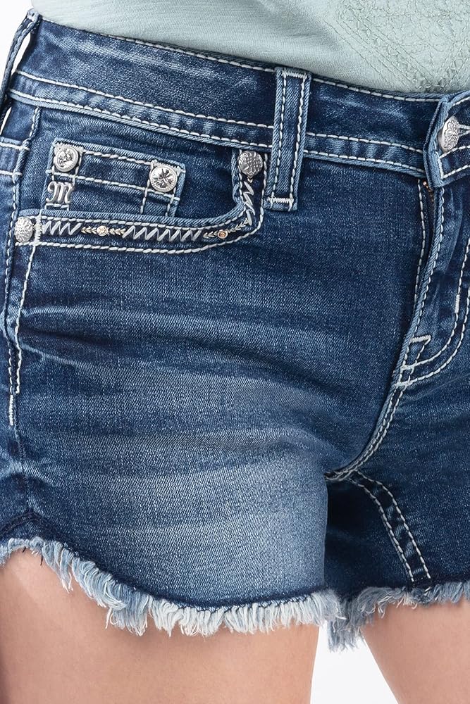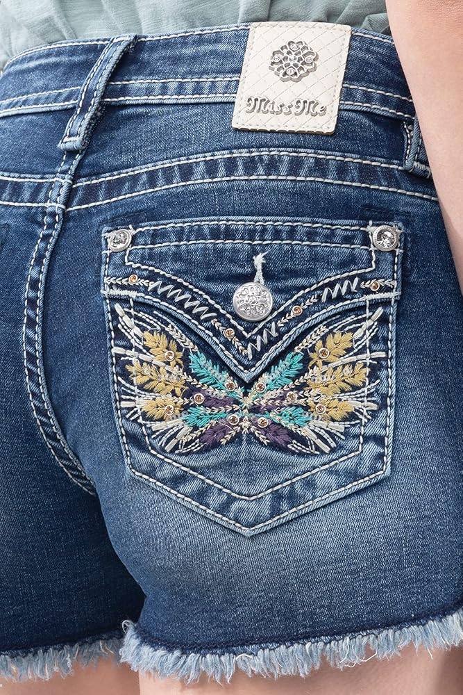 Features: 5 functional pockets. Faux flap back pockets. Mid waist. Frayed hem. Embellishment detailing.