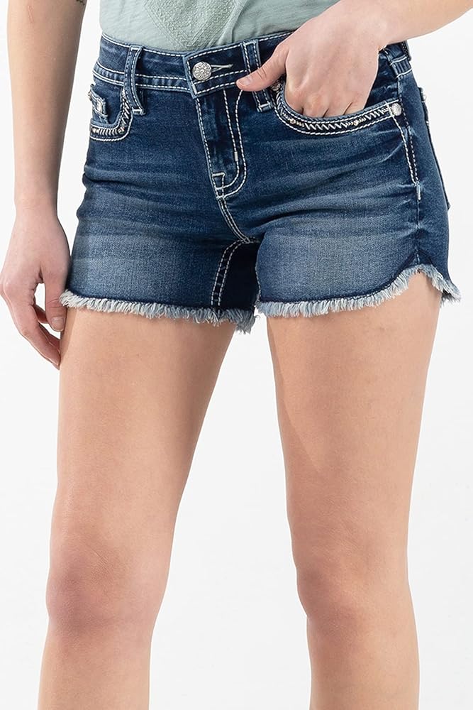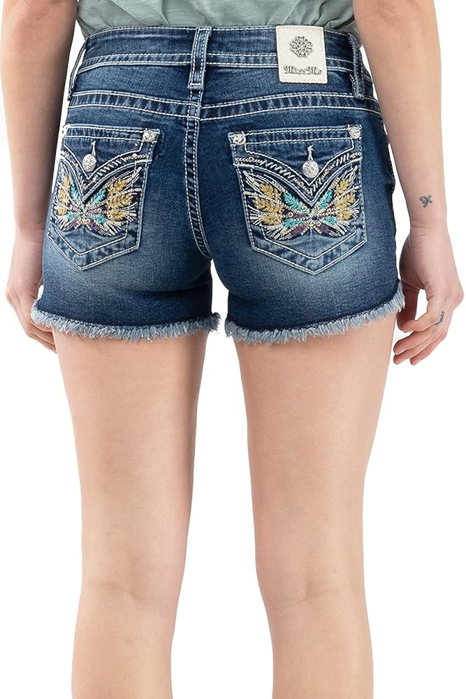 Miss Me Women's Mid Rise Floral Winged Faux Flap Pocket Shorts With Frayed Hem