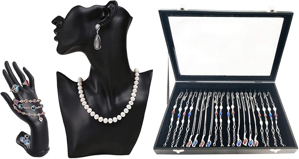 مجموعة من 3 قطع من تمثال عرض المجوهرات من بابينيمو وصندوق مجوهرات مع سطح زجاجي