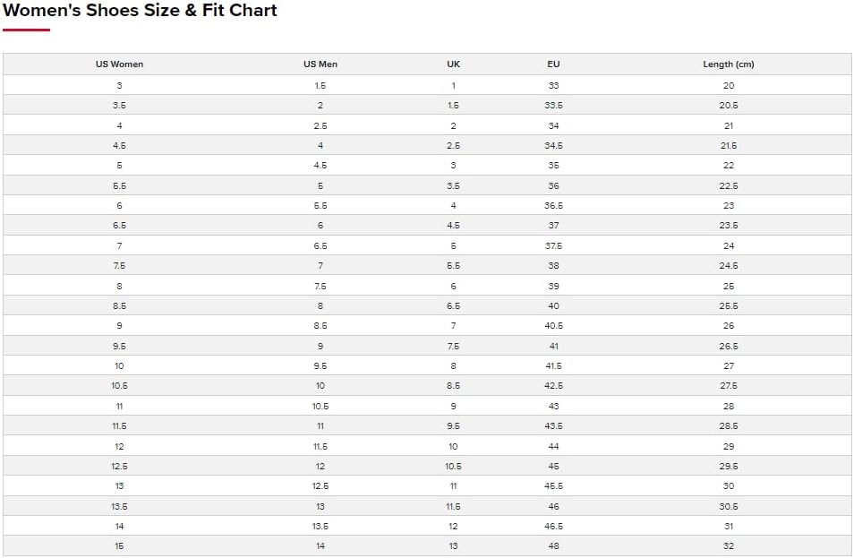 وحدة الأحجام الولايات المتحدة وكندا 4 4.5 5 5.5 6 6.5 7 7.5 8 8.5 9 9.5 10 10.5 11 11.5 12 المملكة المتحدة 2 2.5 3 3.5 4 4.5 5 5.5 6 6.5 7 7.5 8 8.5 9 9.5 10 أوروبا 35 35 35-36 36 36-37 37 37-38 38 38-39 39 39-40 40 40-41 41 41-42 42 42-43 بوصات 8.2 8.3 8.5 8.8 8.9 9.1 9.3 9.4 9.5 9.7 9.9 10 10.2 10.3 10.5 10.7 10.9 سنتيمتر 20.8 21.3 21.6 22.2 22.5 23 23.5 23.8 24.1 24.6 25.1 25.4 25.9 26.2 26.7 27.1 27.6