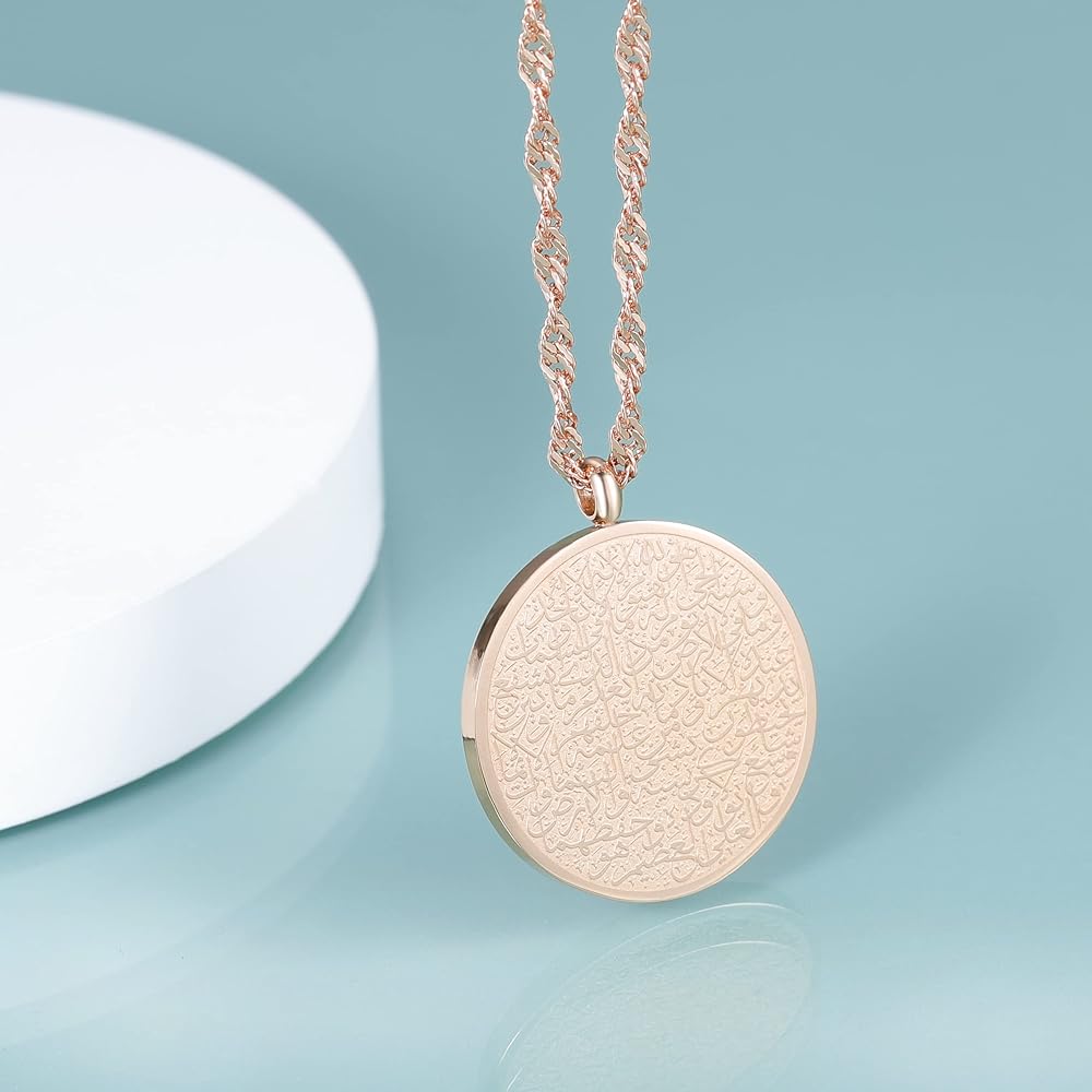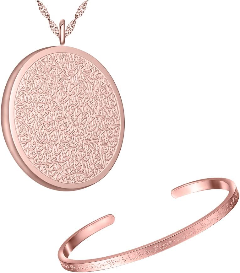 🎁NECKLACE & CUFFS SIZE: Islam Muslim Allah Ayatul Kursi Necklace 45 Cm+5CM Chain Necklace For Women Jewelry, Diameter 2.6" W/0.16", L/6", Adjustable open size bent easily can fit for most wrist, Inspirational gift idea for sister, daughter, wife, firend, aunt, etc. Amazing Graduation gift, Christmas gift, Birthday Gift, Mother's day Gift.
