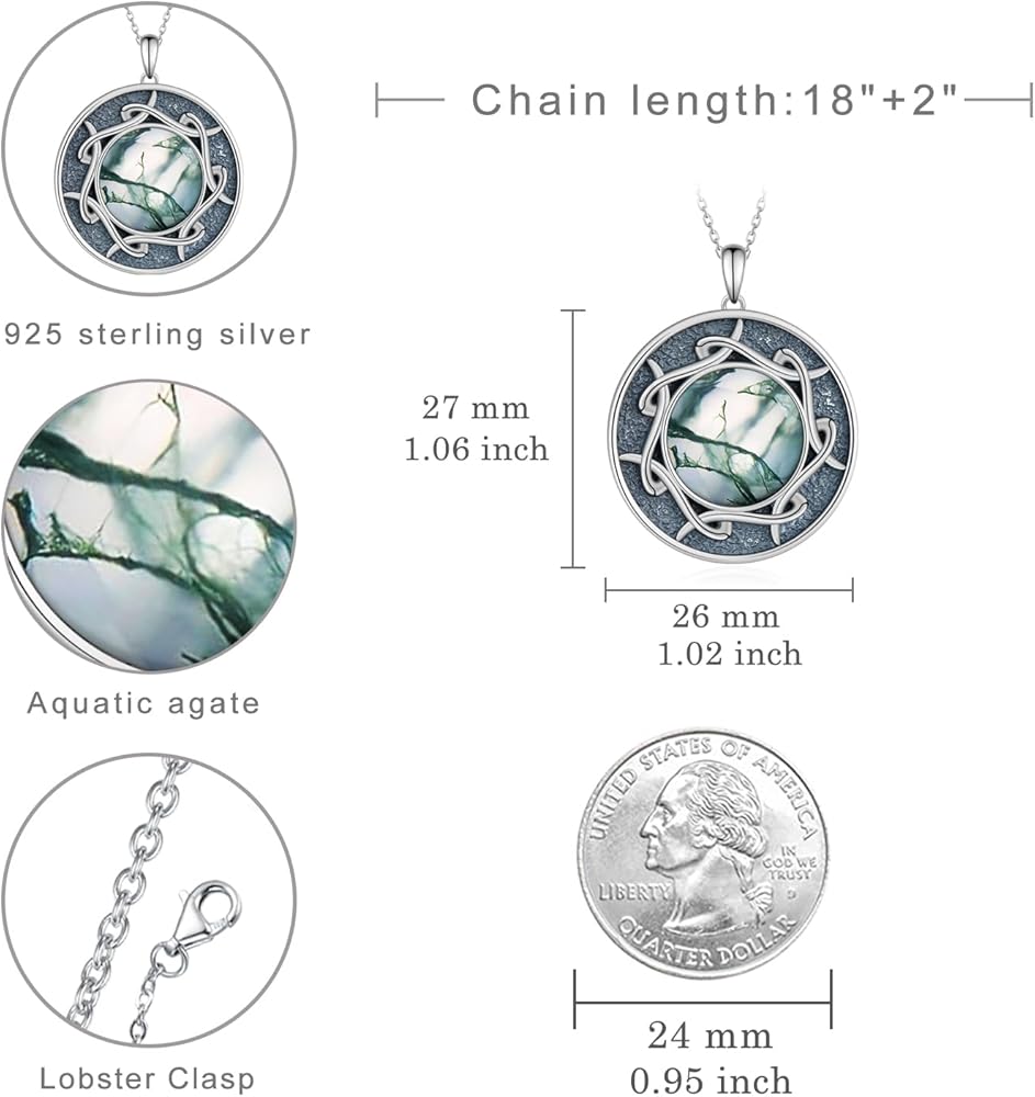 قلادة من الفضة الإسترلينية بحجر العقيق الطحلب الحجم: 26 مم × 27 مم (1.02 × 1.06 بوصة)، الطول: سلسلة تمديد 18+2 بوصة، مناسبة كهدية مجوهرات من العقيق الطحلب للنساء.