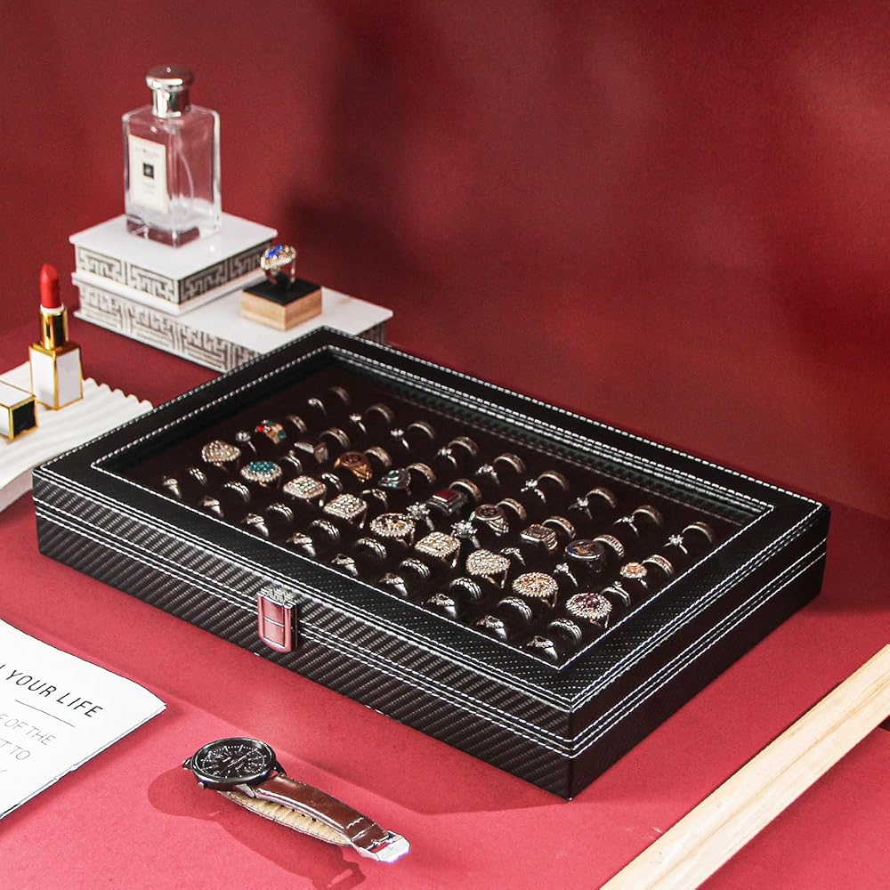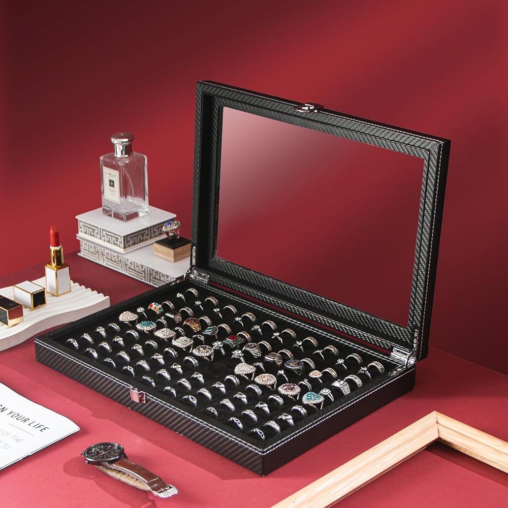With 100 slots, Siveit ring tray holds up to 100 rings. We use the transparent glass as the top window because it helps to beautifully display your collections and you can easily pick your favorite rings for any occasion
