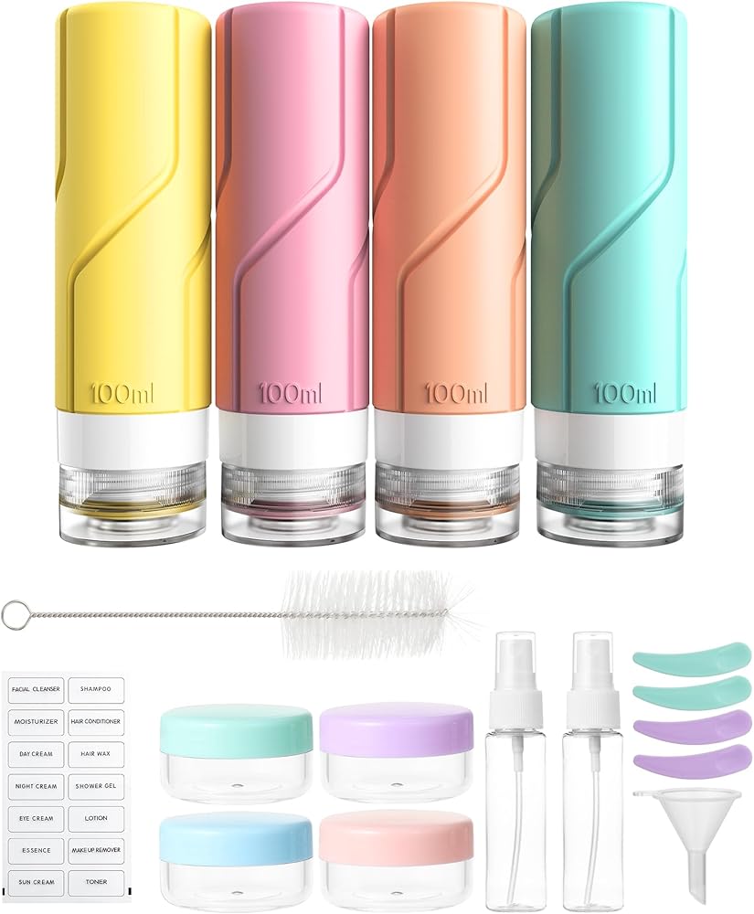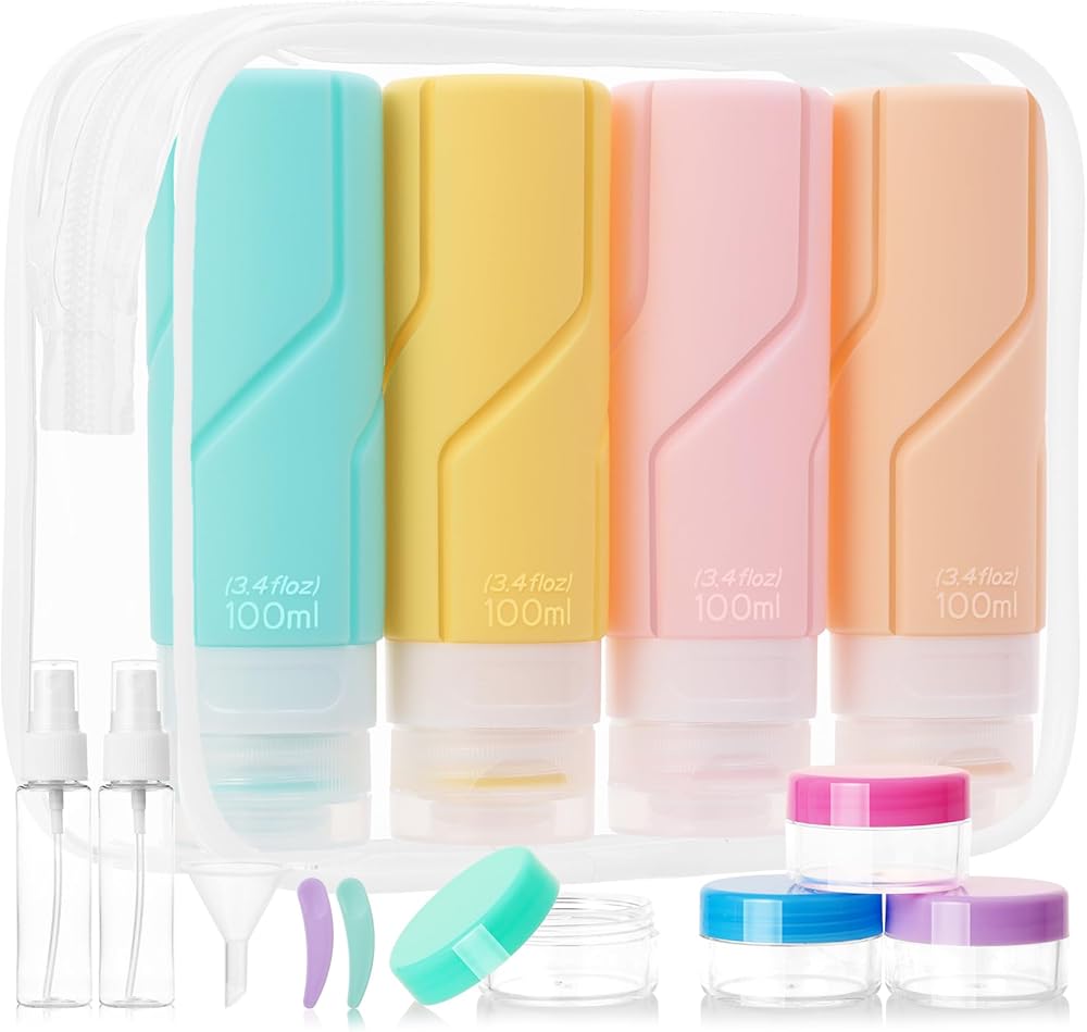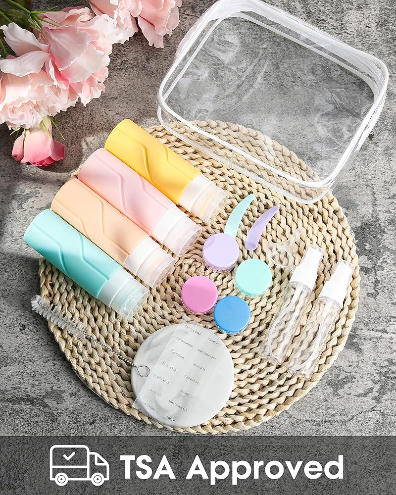 16 عبوة من زجاجات السفر، حاويات سفر من السيليكون مضادة للتسرب معتمدة من إدارة أمن المواصلات الأمريكية لمستلزمات الاستحمام، زجاجات أدوات الزينة للسفر، أساسيات السفر السائلة القابلة لإعادة الملء لوشن الشامبو والبلسم