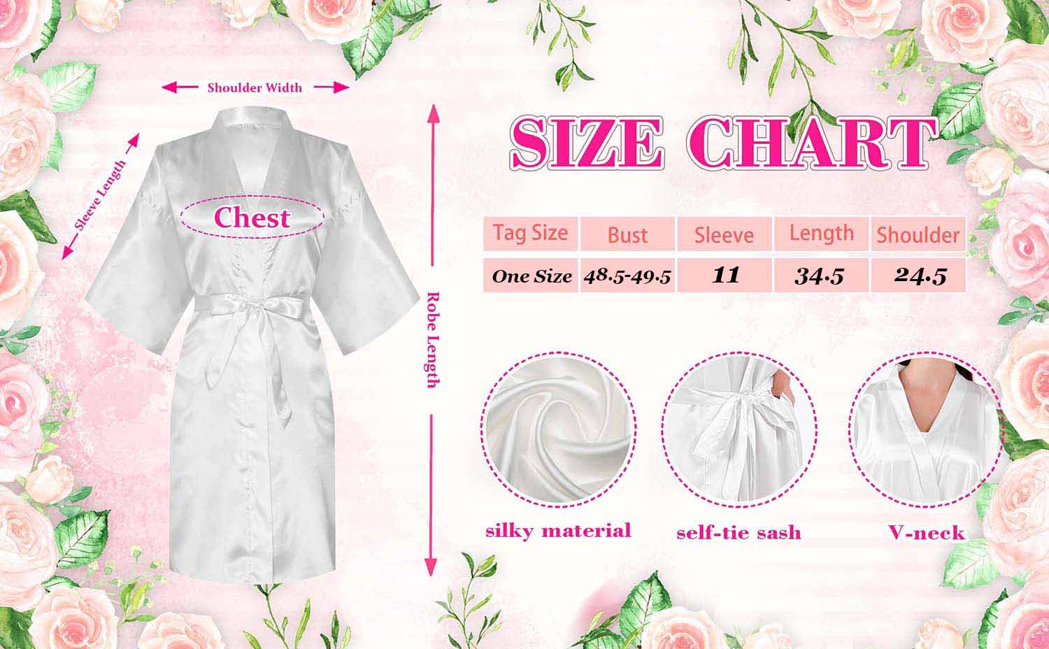 مقاس واحد يناسب معظم الجلباب: طول منتصف الفخذ 86.36 سم؛ الصدر-49.5 بوصة؛ أكمام بطول 3/4 بوصة - 11 بوصة، مناسبة لمعظم الأشخاص الذين يتراوح طولهم من 4'11 بوصة إلى 5'9 بوصة، ويزنون من 90 إلى 165 رطلًا ومقاسًا من 0-12. مع تصميم رداء الكيمونو ذو الوشاح ذاتي الربط، تم تصميم هذه الرداء لتناسب فتياتك بشكل مثالي ويسهل ارتداؤها وخلعها.