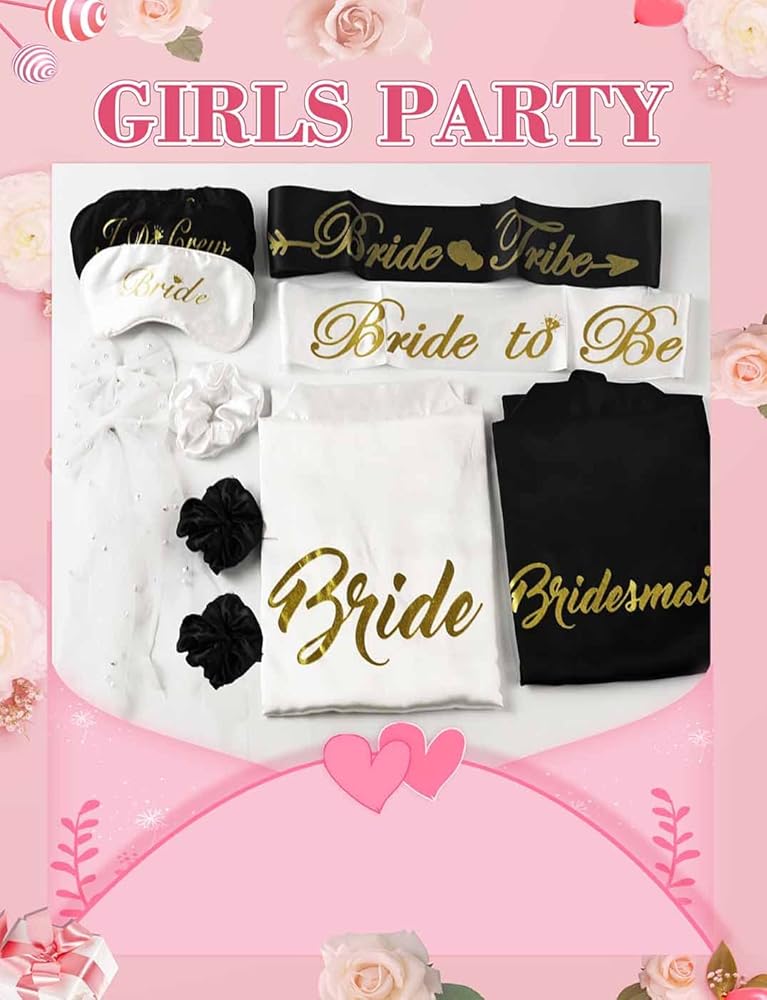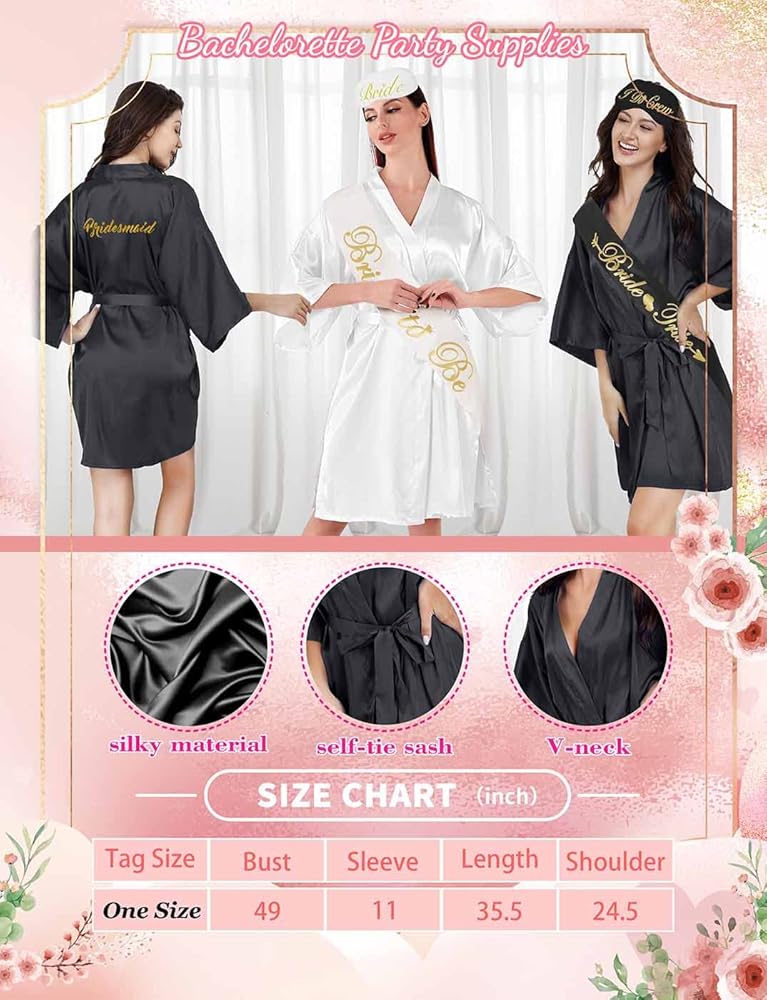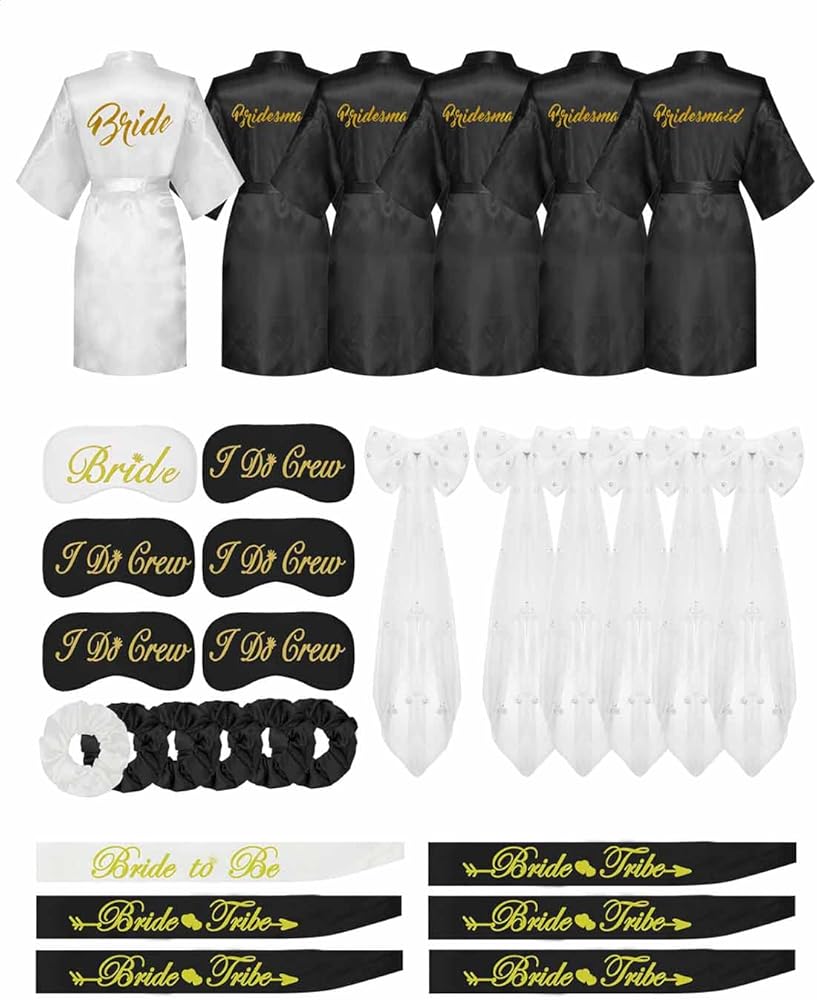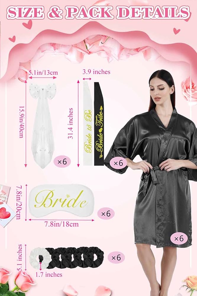 6 عبوات من أرواب حفلات الزفاف: تتضمن عبواتنا المكونة من 6 أرواب حفلات الزفاف 6 قطع من الأرواب ذات الحروف الكبيرة، و6 أقنعة عيون متطابقة، و6 أوشحة حفلات توديع العزوبية متطابقة، و6 أوشحة على شكل فيونكة لؤلؤية، و6 ربطات شعر. ما مجموعه 30 قطعة العناصر.
