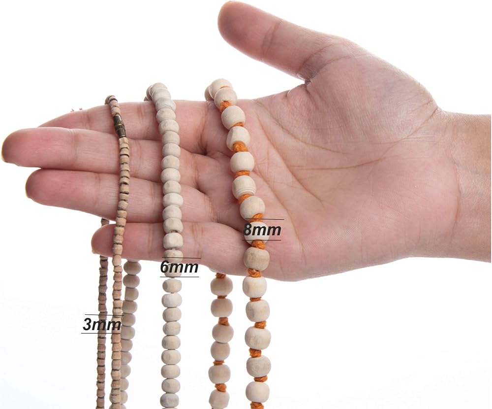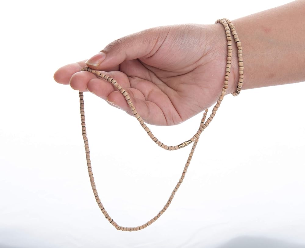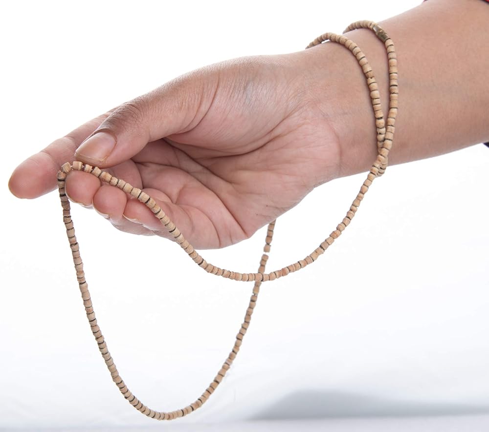 هذه المسبحة العلاجية المنشطة روحيًا مالا تولسي (تولاسي) جابا مالا أو خشب الريحان المقدس مصنوعة من خرز خشبي بني فاتح منحوت يدويًا وخرز خشن محفور يدويًا معقود يدويًا معًا