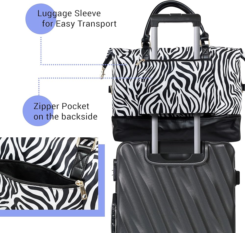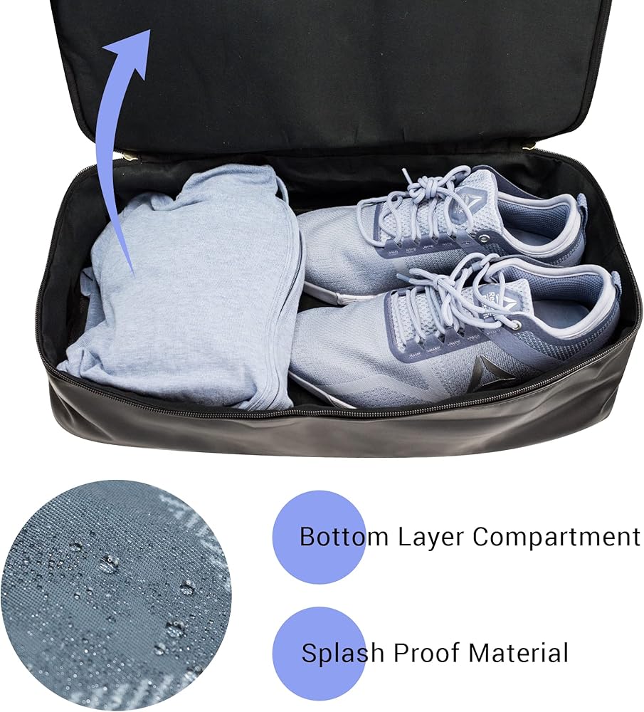 أجزاء متعددة الوظائف: إغلاق بسحاب مزدوج، وجيب رئيسي واسع مع 3 جيوب داخلية، و1 سحاب للإغلاق، و2 مفتوحين. يوجد أيضًا جيبان تنظيميان خارجيان بسحاب للإغلاق، أحدهما الأكبر موجود في الجزء السفلي من حقيبة عطلة نهاية الأسبوع ويمكن استخدامه للحفاظ على حذائك أو ملابسك المتسخة أو المناشف المبللة منفصلة عن الحجرة الرئيسية، والجيب الأصغر هو أيضًا الأمتعة الأكمام التي تتيح سهولة الوصول إلى الملحقات الصغيرة والضروريات اليومية.