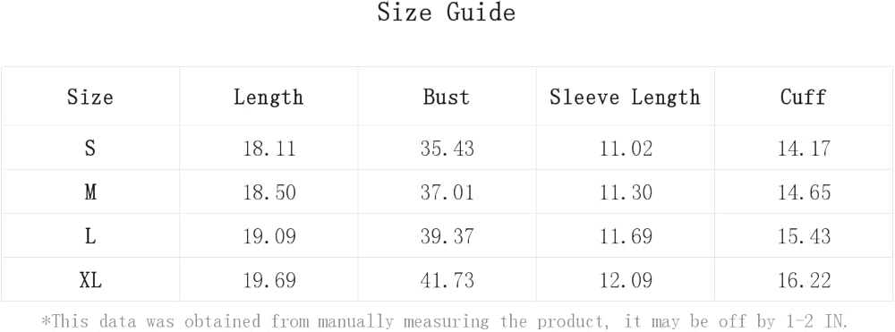 Small: Bust: 35.4", Cuff: 14.2", Length: 18.1", Sleeve Length: 11"