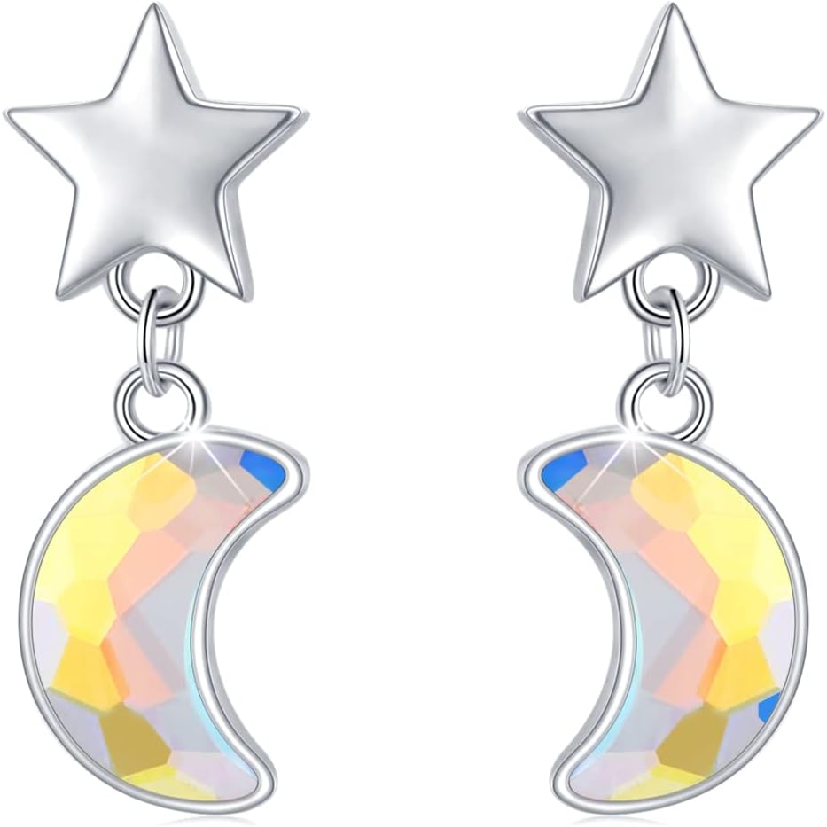 Crystal Crescent Moon and Star Earrings Stud Drop Earrings.