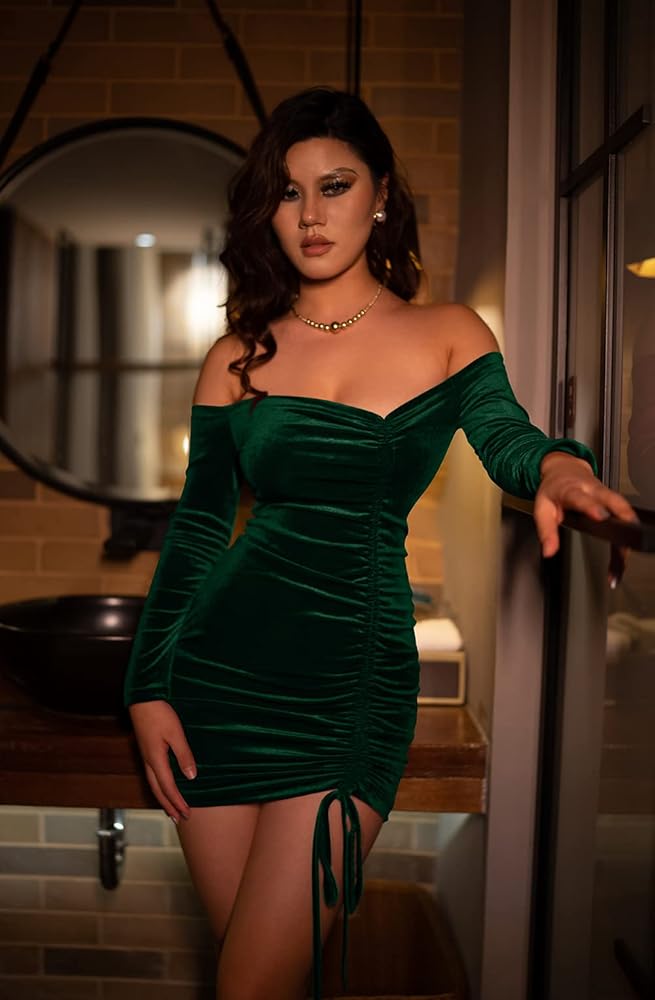 GOBLES Womens Velvet Bodycon Ruched Sexy Off Shoulder Bodycon Mini Club Dress